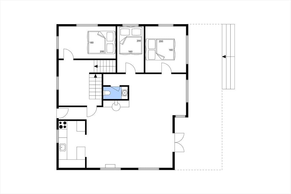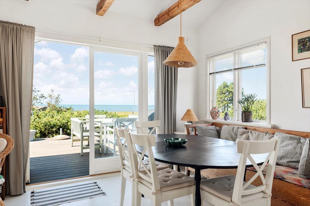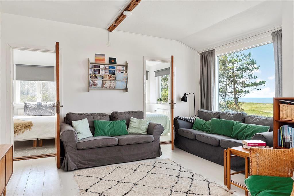 Feriehuset på ca. 80 m² har en hyggelig opholdsstue med sidde- og spiseplads, pejs, tv samt tre soveværelser, hver med en dobbeltseng. På hemsen findes der yderligere tre sovepladser på madrasser. Køkkenet er udstyret med køleskab med fryser, elektrisk komfur med keramiske kogeplader og opvaskemaskine. Her er også et gæstetoilet med wc og håndvask. I kælderen er badeværelset med badekar, bruser og wc, samt vaskemaskine og tørretumbler. Huset kan opvarmes med centralvarme, og takket være en facaderenovering i 2024, ny isolering og udskiftning af vinduer, holder det sig dejligt varmt – selv i de kolde måneder. Den store terrasse mod sydvest med havemøbler giver en fantastisk udsigt over Østersøen.