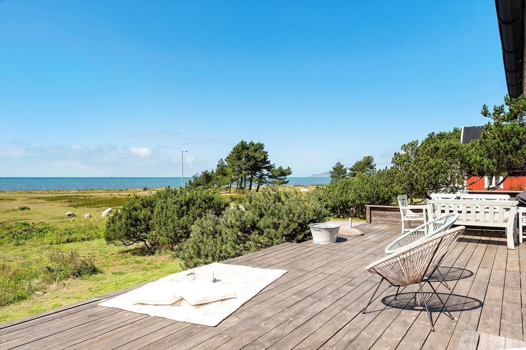 Dette feriehus ligger knap 20 km nord for Helsingborg, på en ca 2.000 m² stor grund, i landsbyen Nyhamnsläge, direkte ved Østersøen. Ikke langt derfra ligger Kullaberg, et område kendt for sine stejle klipper og rige naturoplevelser. Nyhamnsläge byder på en rigtig god badestrand, hvilket gør det til et perfekt sted at nyde sommeren. Landsbyen har mange smukke gamle huse, og den lille havn er også et besøg værd, her kan man også købe ind og finde et pizzeria. En fin cykelsti fører til Höganäs. Fra Nyhamnsläge er der ikke langt til slottene Lerhamn og Krapperup, der begge har kunstudstillinger og smukke parker.