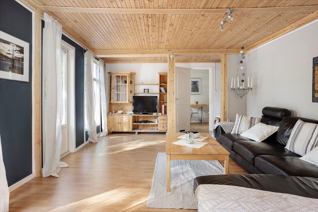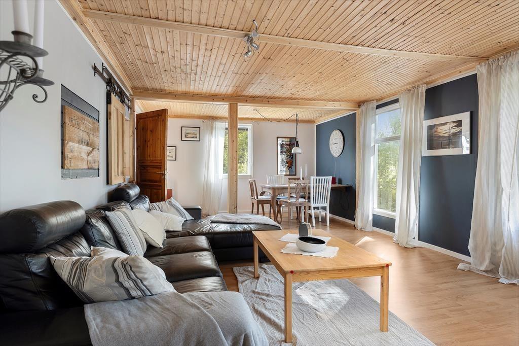 Bei dem zentral in der kleinen Ortschaft auf einem etwa 700 m² großen Gartengrundstück liegenden Ferienhaus mit einer Wohnfläche von etwa 140 m² handelt es sich um ein früheres Kolonialwarengeschäft mit dazugehöriger Wohnung, das in den Jahren 20/21 umfassend und gründlich renoviert und zum Urlaubsdomizil umgebaut wurde. Über eine kleine Eingangsterrasse betritt man das Haus und gelangt durch einen geräumigen Flur, von dem auch die Treppe ins Obergeschoss führt, in die moderne Wohnküche, ausgestattet mit Geschirrspüler, Elektroherd mit Glaskeramikkochfeld und Backofen, Kühl- Gefrierkombination, Mikrowelle und Kaffeemaschine. Von der Küche aus gelangt man zum einen in ein Badezimmer mit WC, Dusche und Handwaschbecken und auf der gegenüber liegenden Seite in ein etwa 30 m² großes kombiniertes Wohn-/Esszimmer mit Essecke, Sitzgruppe mit Smart TV an. An dieses Zimmer schließt sich das eine im Erdgeschoss liegende, mit einem Doppelbett möblierte Schlafzimmer an. Die beiden weiteren Schlafzimmer, ebenfalls mit Doppelbetten möbliert, befinden sich im Obergeschoss des Hauses; ein Kinderbett und ein Kinderstuhl stehen zur Verfügung. Im Obergeschoss gibt es außerdem einen kleines Spielzimmer mit Kinderbüchern, Lego, großer Spielesammlung und einer Schlafcouch, ein zusätzlicher Fernseher mit deutschen Programen sowie ein Lesezimmer mit kleiner Bibliothek. WLAN steht zur Verfügung und das Streamen ist ruckelfrei möglich. Das Haus hat fließend kaltes und warmes Wasser und kann elektrisch und mit dem in der Küche befindlichen Kaminofen beheizt werden. Den Gästen stehen darüber hinaus Gartenmöbel und Grill sowie Waschmaschine und Trockner zur Verfügung. Genutzt werden dürfen außerdem zwei 3-er Kanus und zwei 1-er Kajaks.
