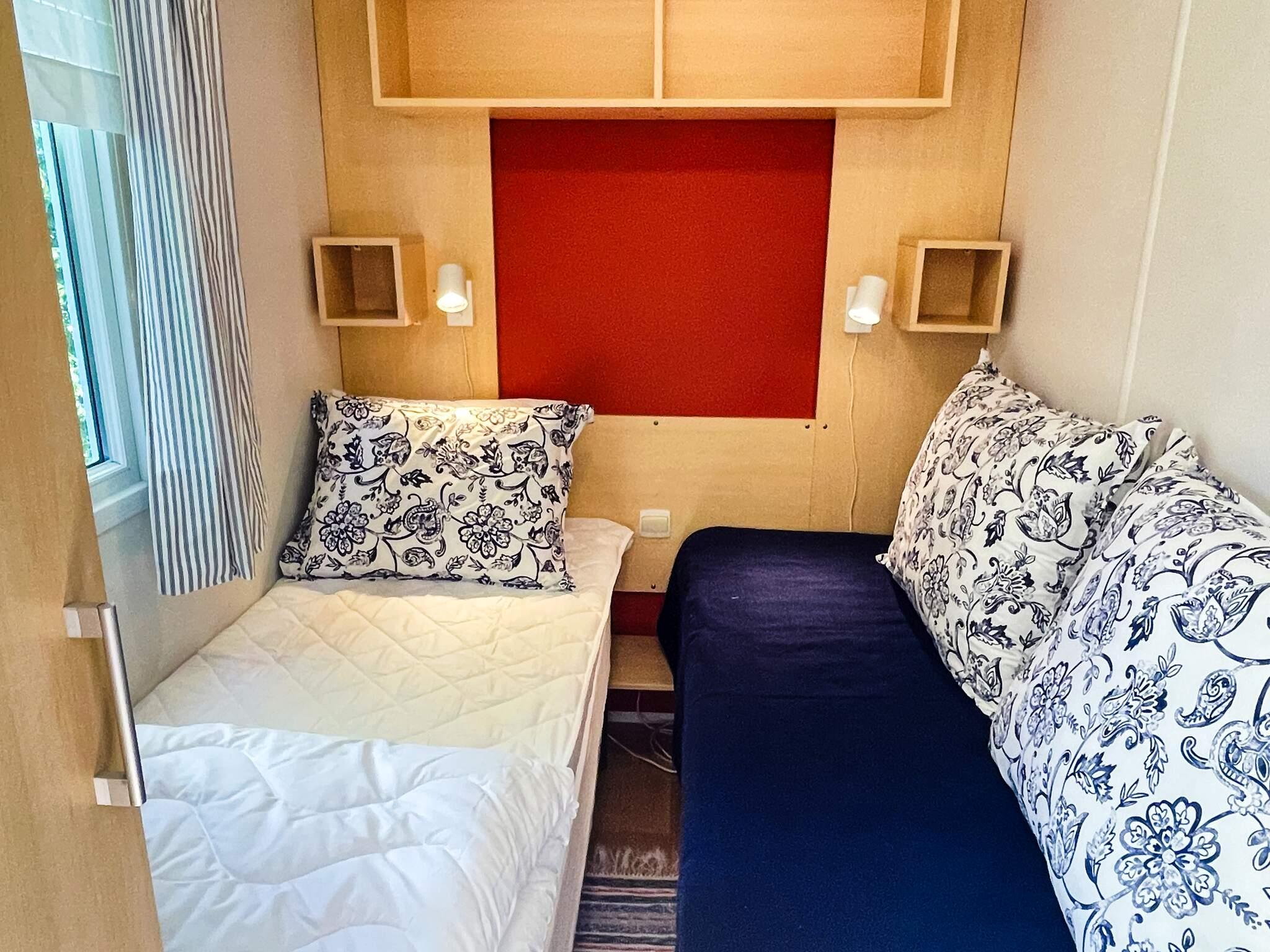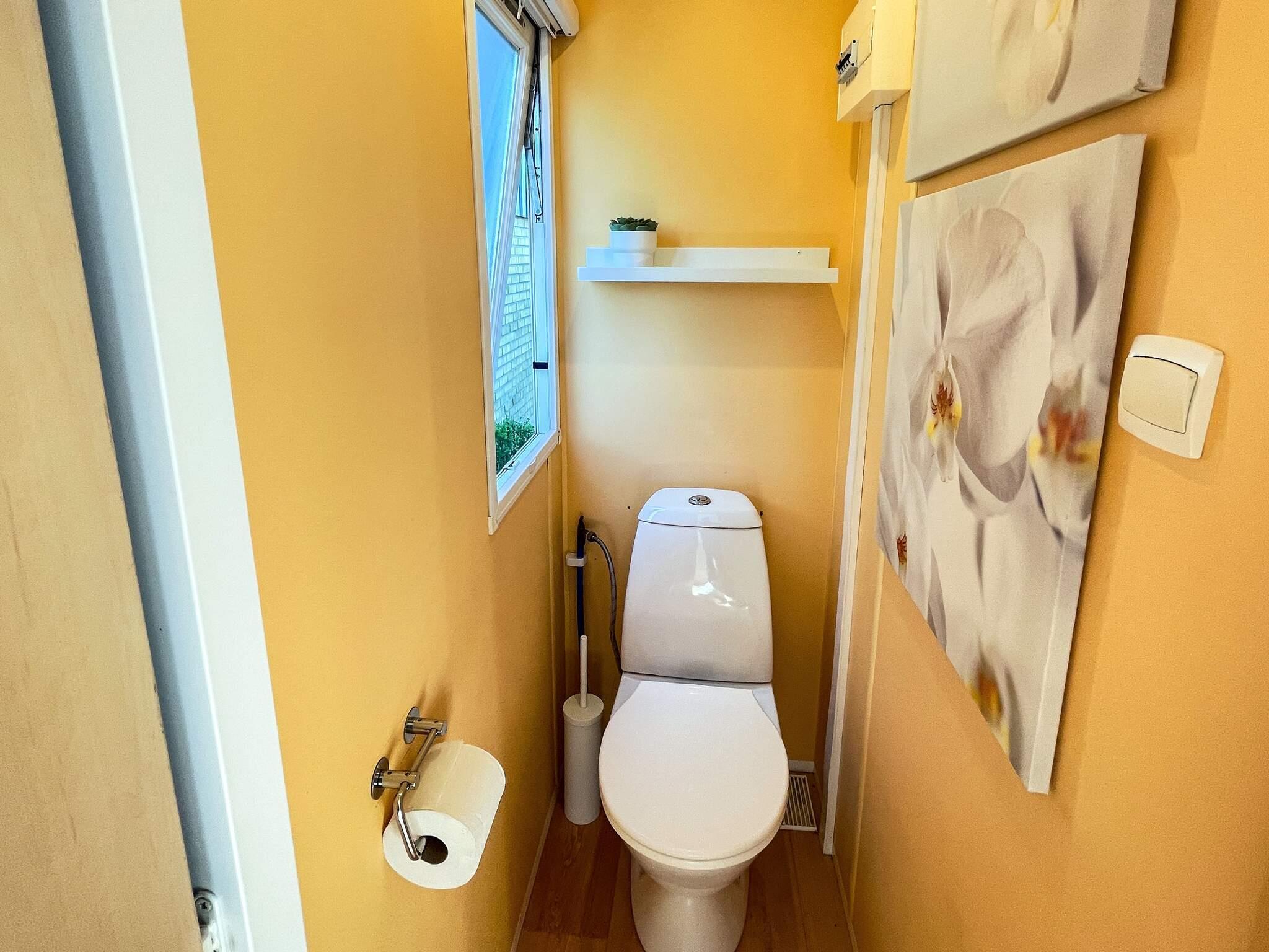 Här bor du bekvämt i ett smart boende med två sovrum – ett med dubbelsäng och ett med två enkelsängar. Köket är utrustat med det du behöver för att fixa frukost eller enklare måltider, och matplats finns för fyra personer. Här har du en separat toalett och ett badrum med dusch och handfat. Utanför finns en solig altan med utemöbler och kolgrill – en perfekt plats för sköna sommarkvällar.