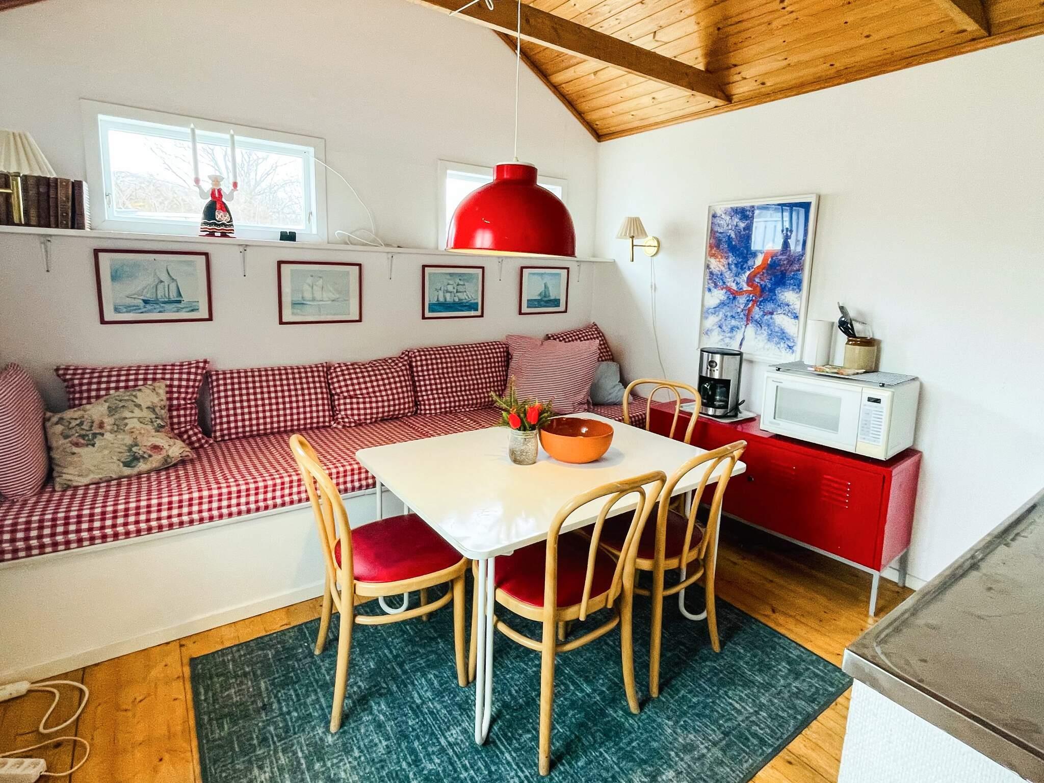 Stugan har en enkel men hemtrevlig karaktär med ett sovrum som rymmer två enkelsängar. I köket finns köksbord, spis, ugn, mikro och kaffebryggare. Det finns även en lång köksbänk (320cm x 70cm) med madrass som kan fungera som en extra bädd för barn. Badrummet är litet men praktiskt, med wc, dusch och tvättställ. Parkering finns precis intill huset, och två cyklar står till förfogande för den som vill upptäcka ön på två hjul.