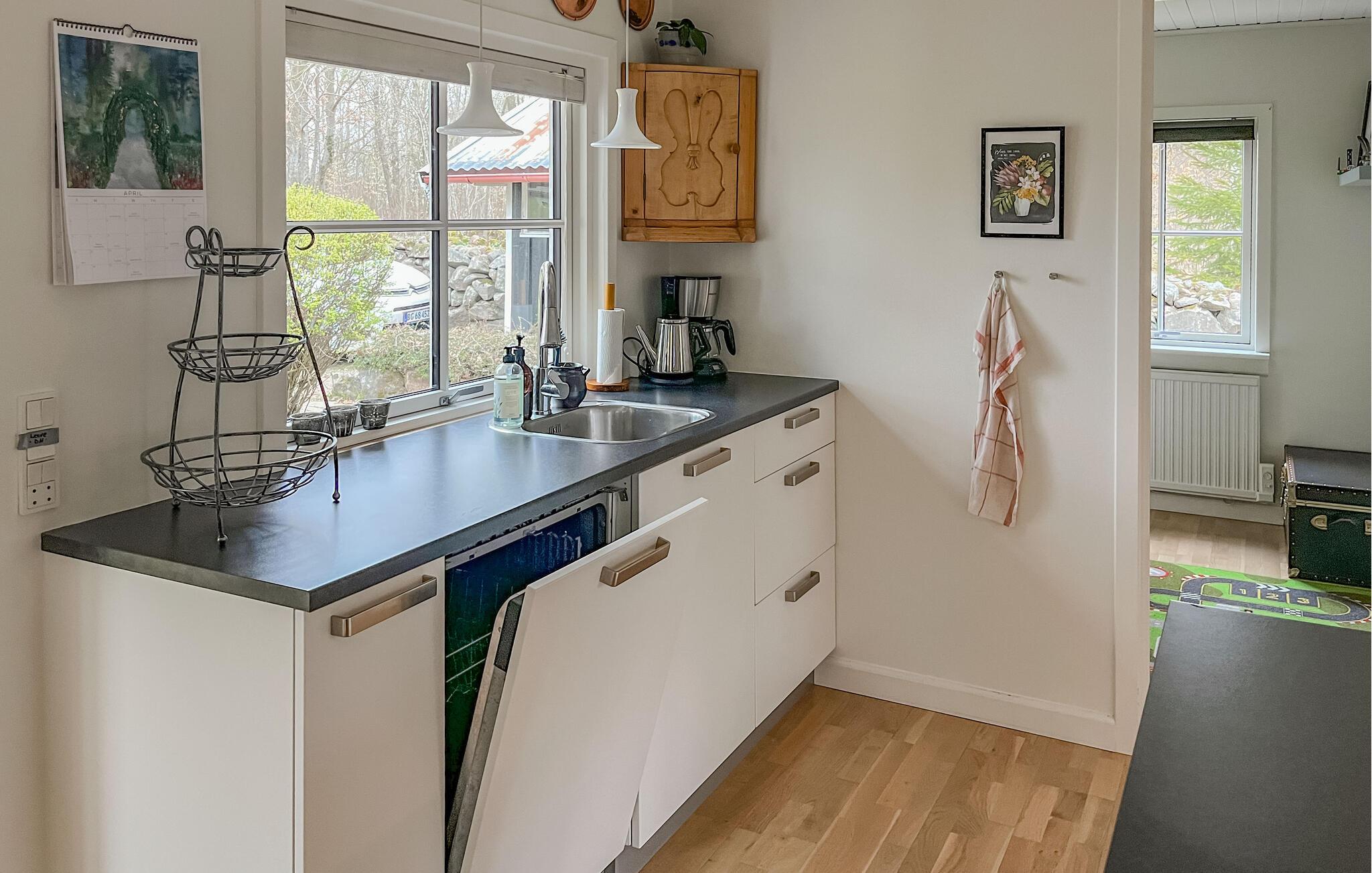 Velkommen til dette familievenlige hus, der ligger i absolut dejlige omgivelser og danner rammen om en herlig ferie i det svenske. Huset er dejligt indrettet med åbent bolig koncept, komfortable møbler og et veludstyret køkken, hvor familiens kokke kan kræse om livretterne, mens andre dækker op ved spisebordet med udsigt til haven. Bider vejret lidt fra sig, kan I tænde op i brændeovnen, der giver varme og det helt perfekte lydtapet til en skøn aften med brætspil, film eller hver jeres bog i den bløde sofa.