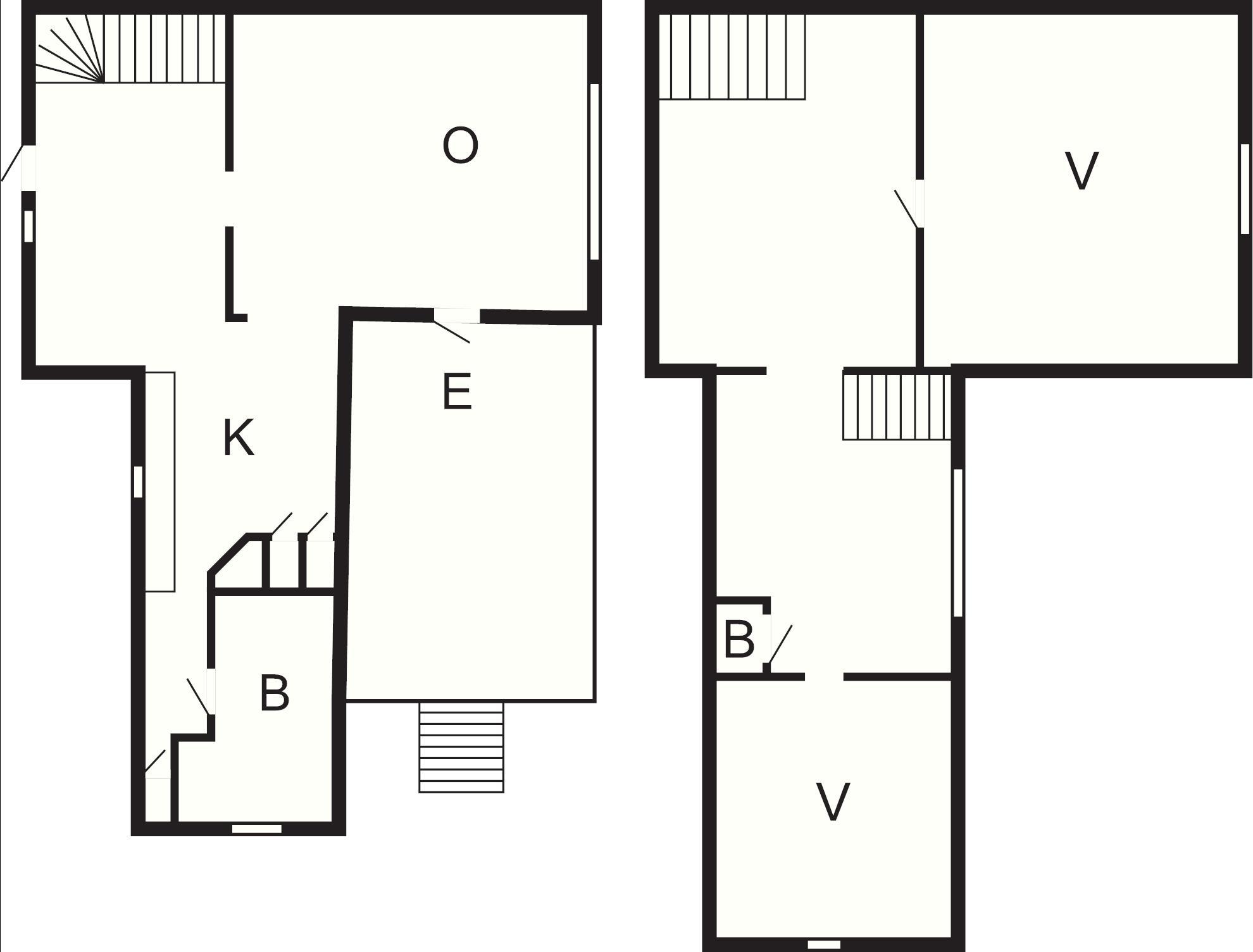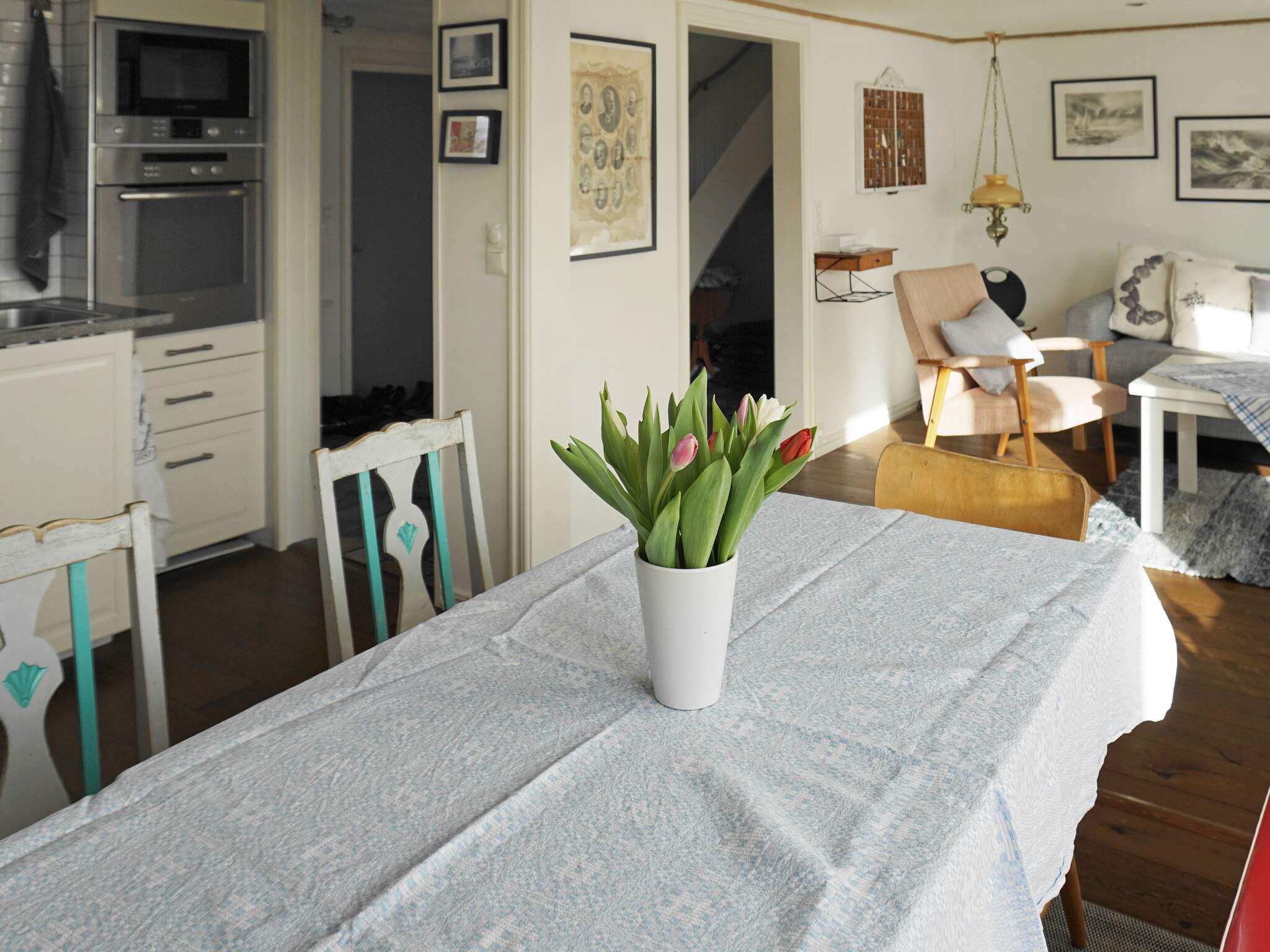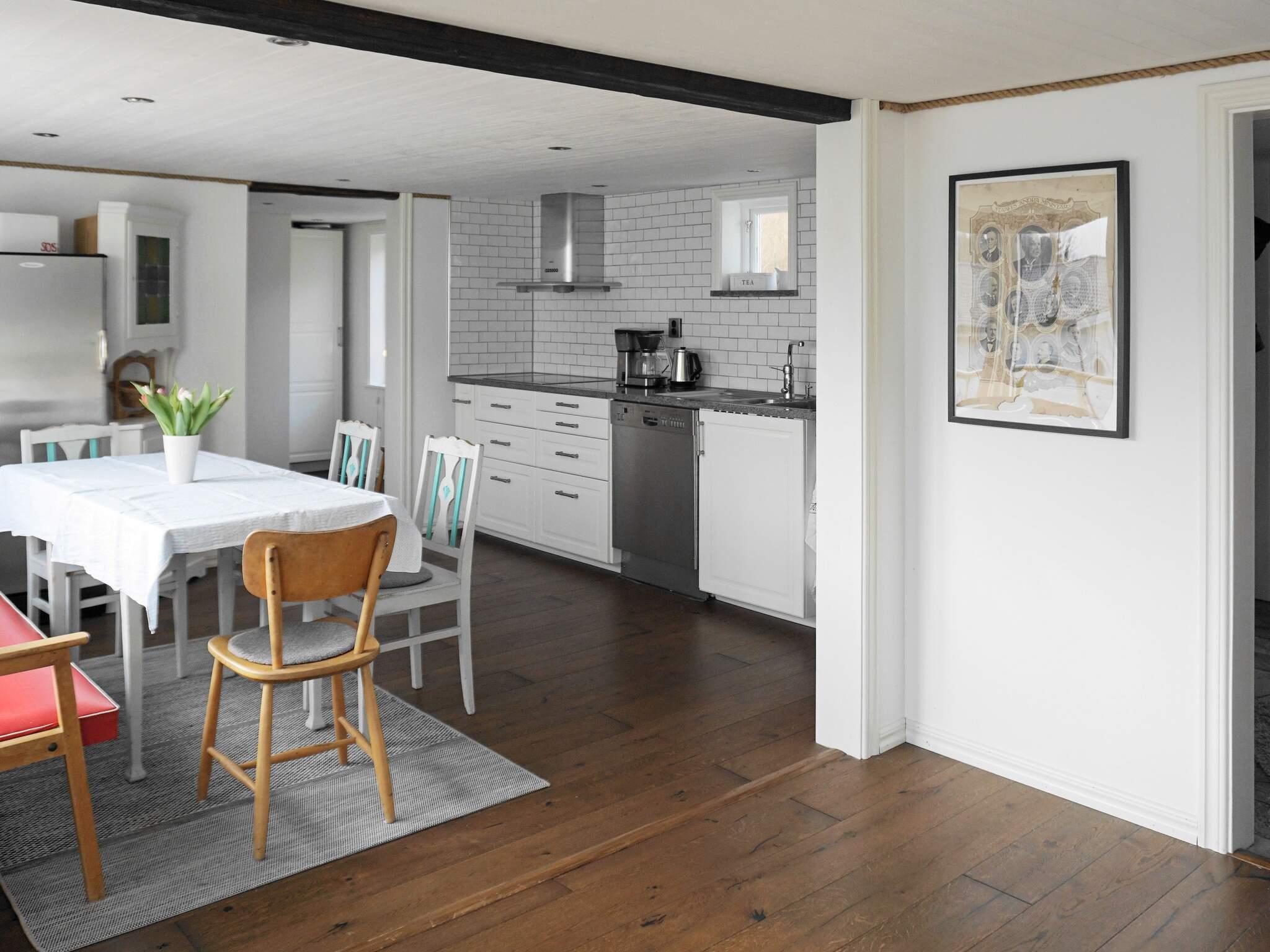 Huset är i två plan, där entréplan har öppen planlösning med modernt kök med matplats vardagsrumsdel med bäddsoffa och utgång till altanen. Här finns även badrum med WC samt nedsänkt badkar och dusch. En trappa upp ligger de två sovrummen, ett med dubbelsäng och det andra med två enkelsängar lämpliga för barn. Här finns även ett TV rum med chromecast samt ett extra WC.