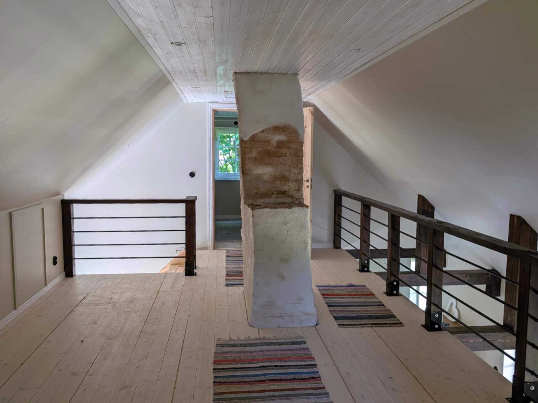 Husets nedervåning bjuder på en öppen planlösning mellan det moderna köket och det ljusa vardagsrummet – perfekt för umgänge och avkoppling. Här finns också ett sovrum med dubbelsäng samt ett rymligt badrum med dusch, tvättmaskin och gott om plats. En trappa upp möts du av ett luftigt allrum med soffa och TV – en skön plats för lugna stunder. På samma våningsplan ligger två sovrum, båda utrustade med två enkelsängar. Från övervåningen är det delvis öppet ner mot vardagsrummet, med ett tryggt räcke som ramar in rymden.