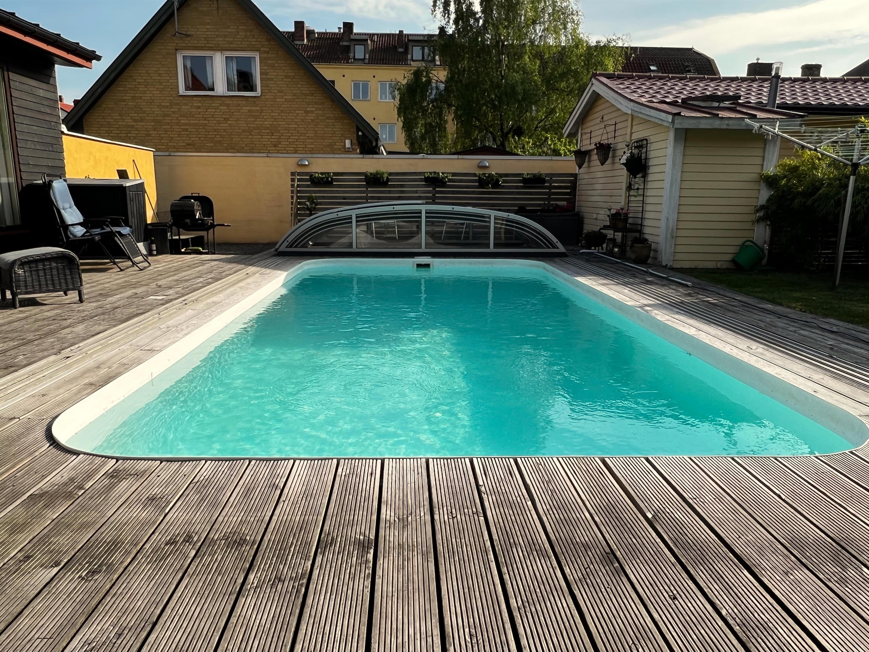 Her kan I bo rigtig godt i et helt nyrenoveret feriehus, der er indrettet i en tilbygning til ejerens ejet hus. Poolen deles med ejeren, men I har altid første ret, og I kan bade uforstyrret i 28 grader varmt vand i de sommeruger, hvor poolen er åben.