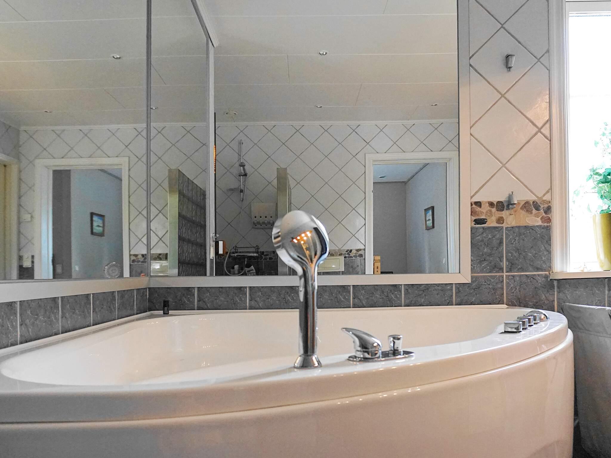 Två fina helkaklade badrum där det större har spa-avdelning med avkopplande bubbelbad samt bastu. En trappa ner (via allrum) finns tvättstuga med tvättmaskin och torkskåp.
