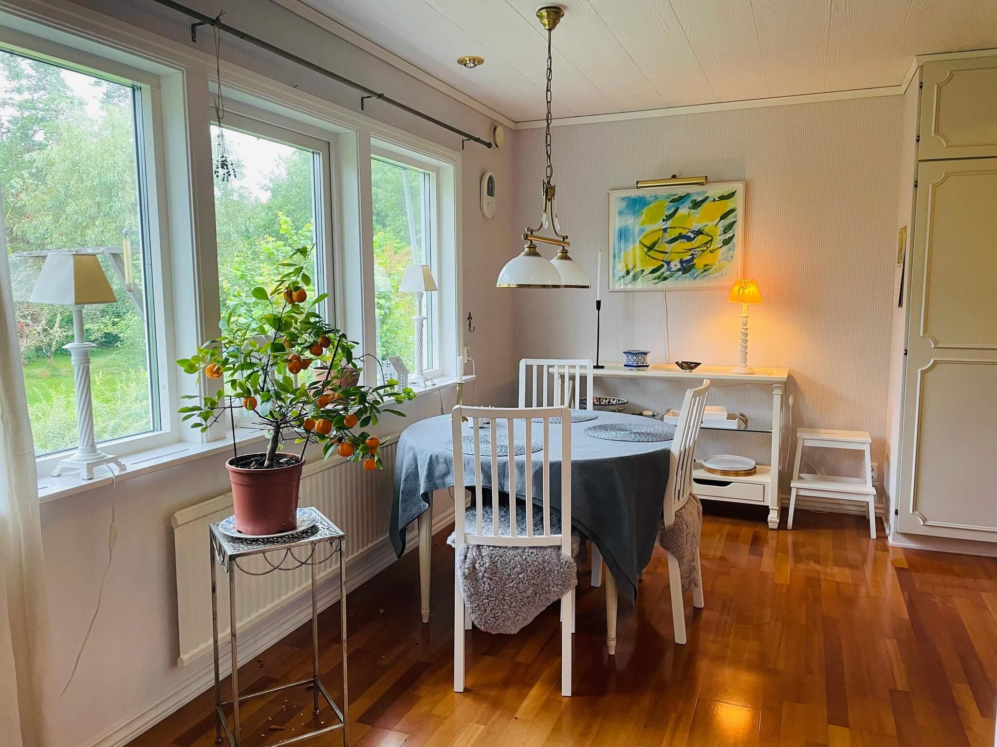 Huset bjuder på generösa umgängesytor där hjärtat är det ljusa vardagsrummet med stora fönsterpartier ända upp i nock. Här finns två bekväma soffgrupper, ett matsalsbord och direktutgång till den stora altanen – en idealisk plats för frukost till fågelkvitter eller grillkvällen efter dagens äventyr.