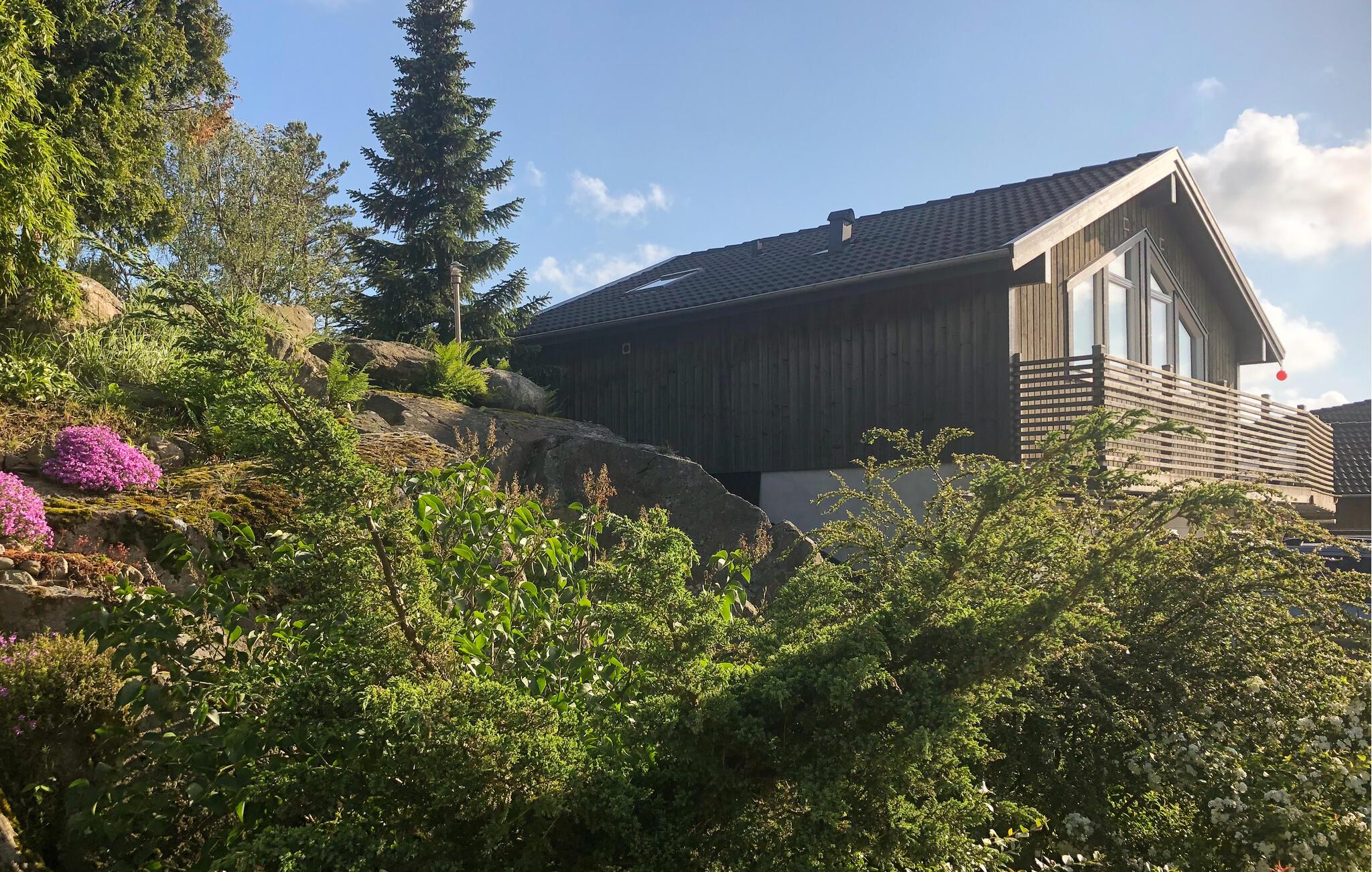 Højt beliggende feriehus i to plan med udsigt til den smukke Bohuskyst med øer og holme fra terrassen.