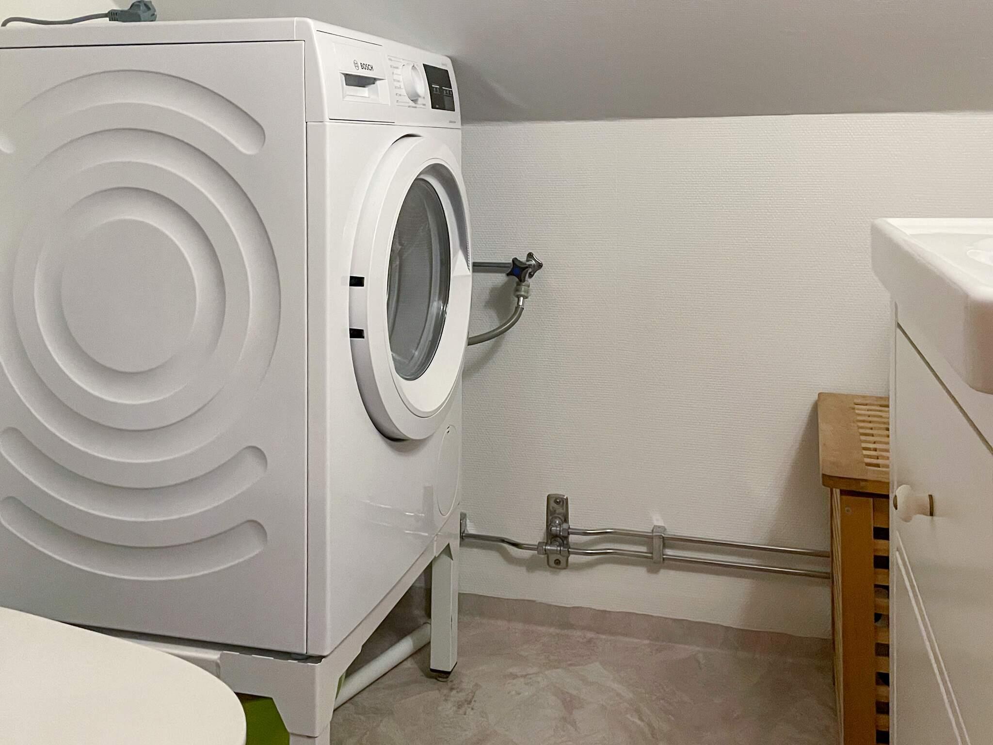 Køkken: ovn, køle-frys, mikroovn, induktionskomfur, kaffemaskine, opvaskemask., vand fra brønd