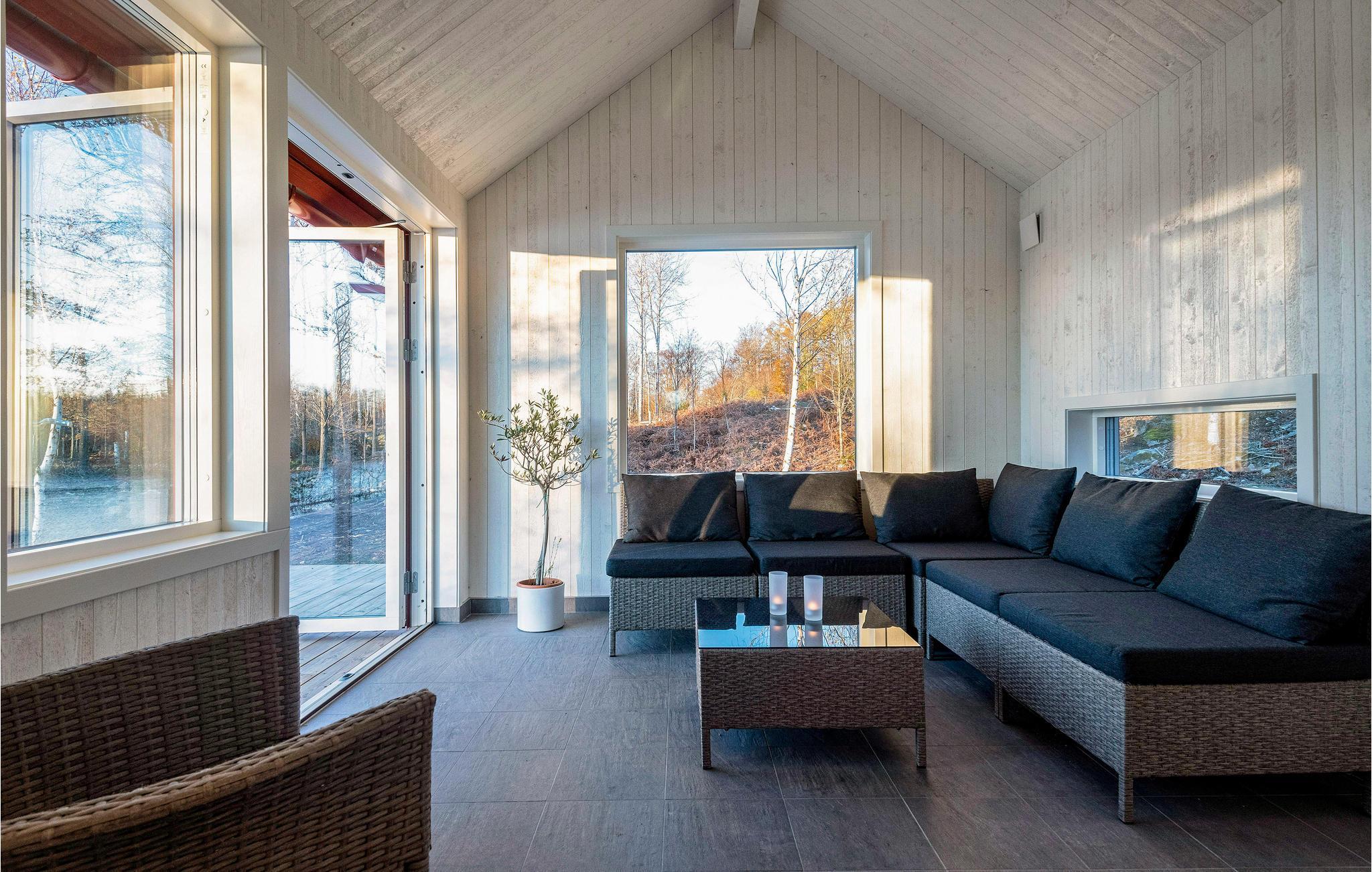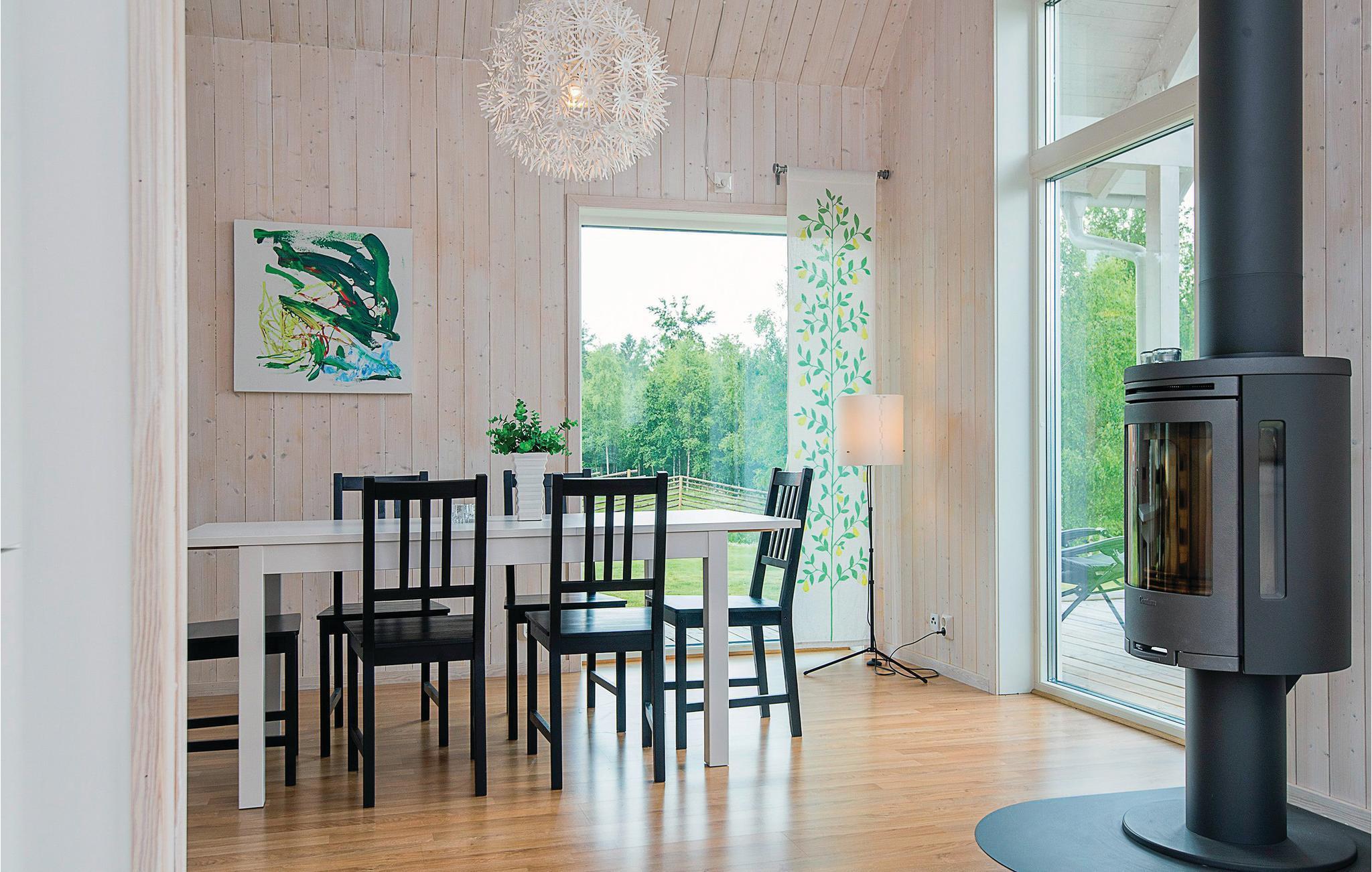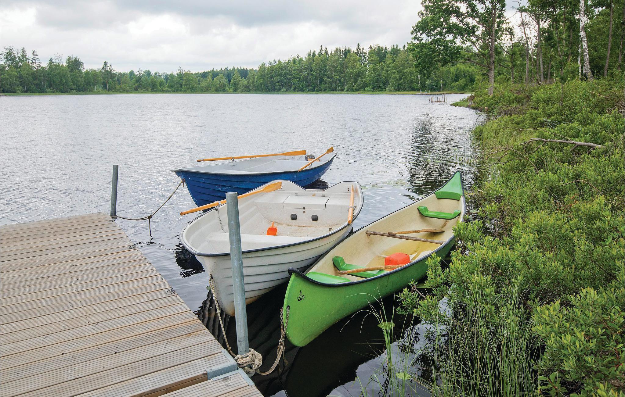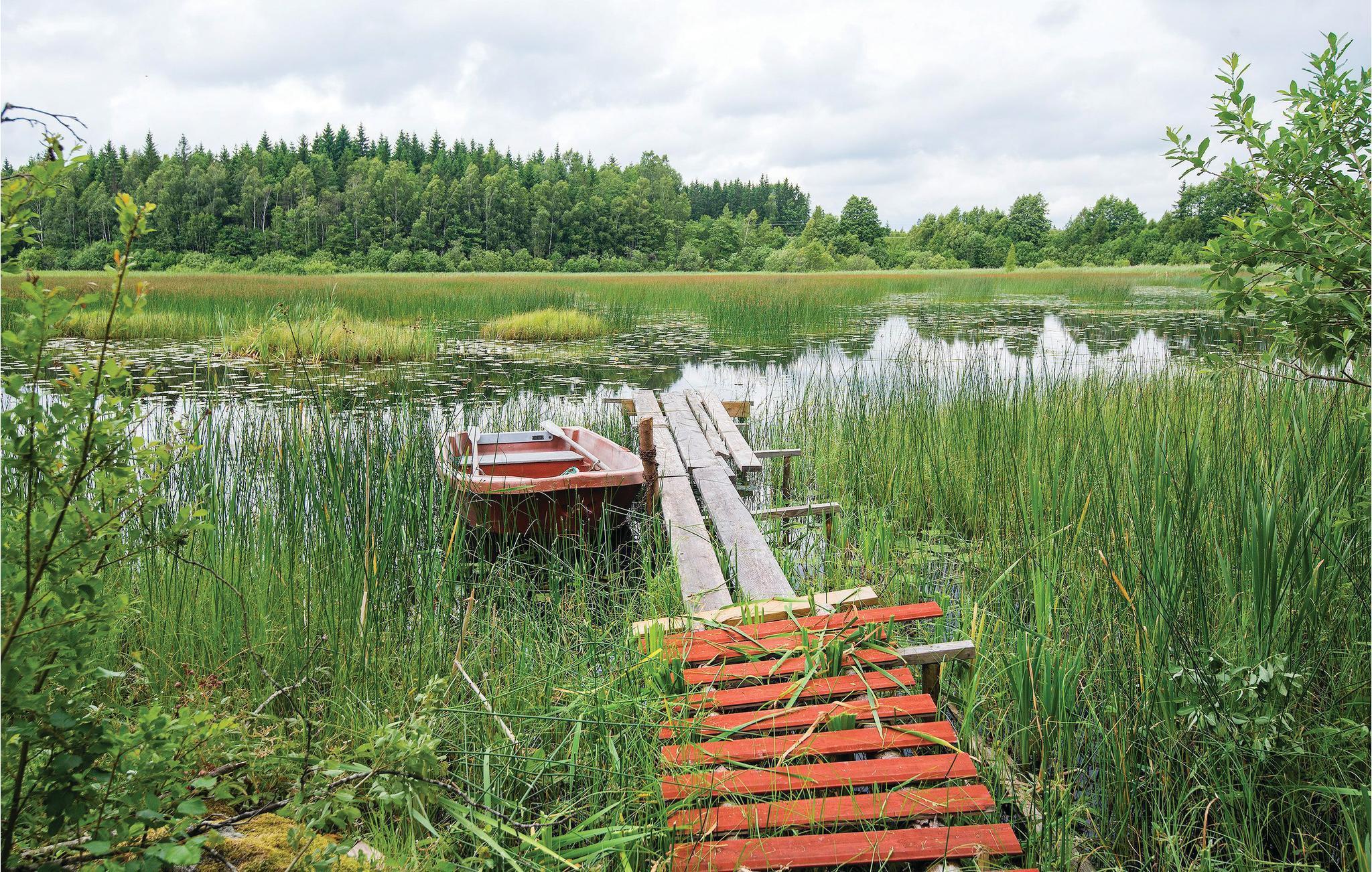 Dette hyggelige feriehus er lyst og praktisk indrettet. Her får I perfekte rammer til en ferie med familie og venner. Der er masser af plads rundt i huset til at lege og slappe af. I kan spise sammen på terrassen eller slutte dagen af ??med en hyggelig grill, mens I nyder udsigten over søen. Det er tæt på to ens huse, ideelt til flere familier, der ønsker at holde ferie sammen. Fra altanen og den delvist overdækkede terrasse har du en smuk udsigt over den tilstødende sø. Børnevenlig svømning i søen Husgölsstacken, hvor du også har adgang til egen båd.