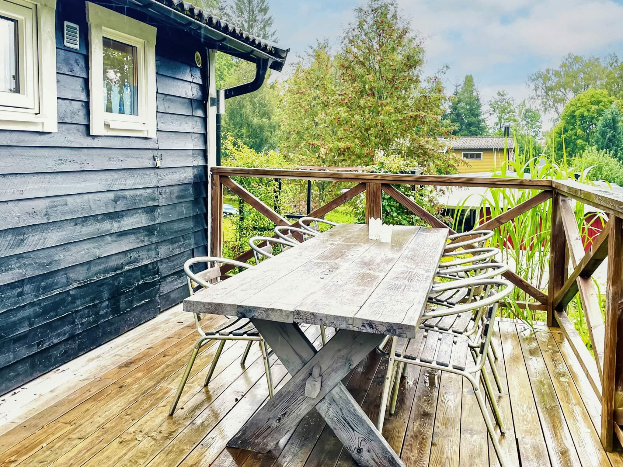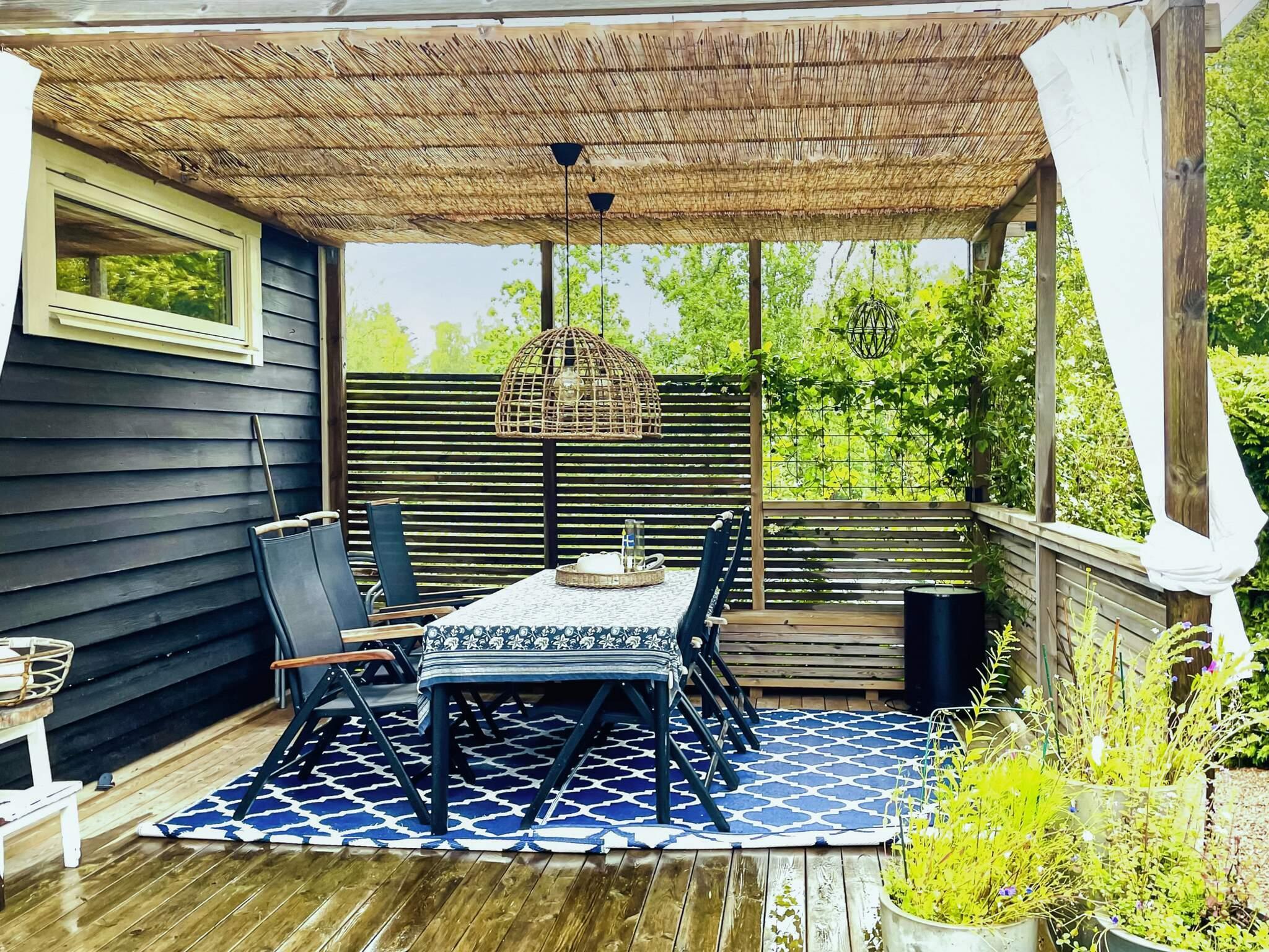 En dörr leder från vardagsrummet till stugans baksida, en riktig pärla med sin lummiga trädgård och lummiga gräsmatta. Det finns flera sittplatser där du kan njuta av dina måltider eller bara ta en kopp kaffe i morgonsolen och insupa lugnet.