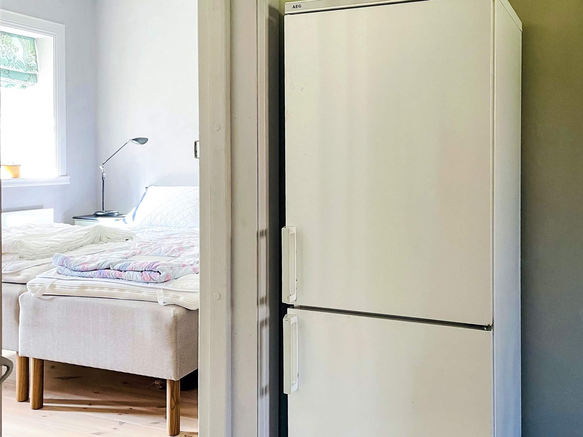 Entrén till stugan hittar du på baksidan. Här kliver du in i ett välplanerat bottenplan med fullt utrustat kök – komplett med kaffebryggare, mikro, spis, airfryer och diskmaskin. Här finns också ett matbord med plats för fyra. Det rymliga sovrummet har en dubbelsäng 160 cm och altandörr ut mot naturen, medan det stora vardagsrummet rymmer både bord och stolar – perfekt för mysiga kvällar. Badrummet har dusch och toalett.