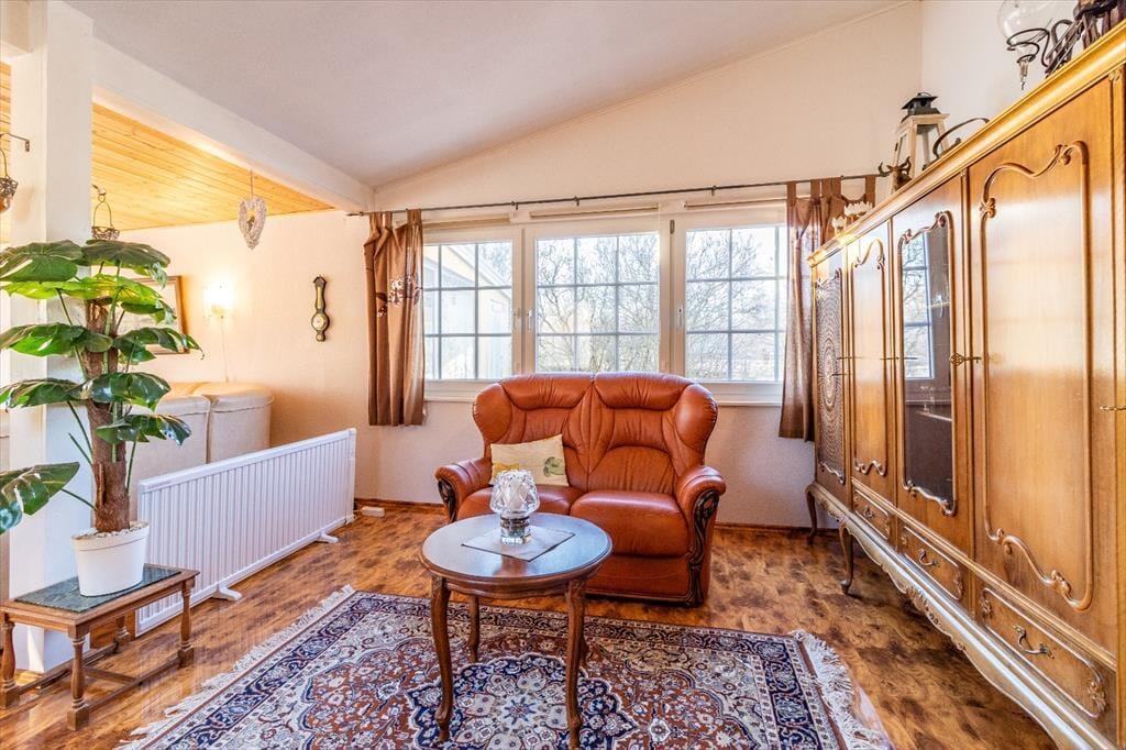 Stueetagen indeholder køkken, spisestue, stue, to soveværelser og det andet badeværelse (WC, bruser, bidet). Køkkenet er fuldt udstyret med 4-plade komfur, ovn, emhætte, køle-/fryseskab, opvaskemaskine, mikrobølgeovn og kaffemaskine. I stuen kan du slappe af foran brændeovnen, se tyske TV-programmer eller bruge CD/DVD-afspiller og radio. Det første soveværelse i stueetagen har dobbeltseng, det andet køjeseng. På første sal findes det tredje soveværelse med dobbeltseng og enkeltseng. På kolde dage sørger elvarme for komfort. Internet er ikke tilgængeligt.