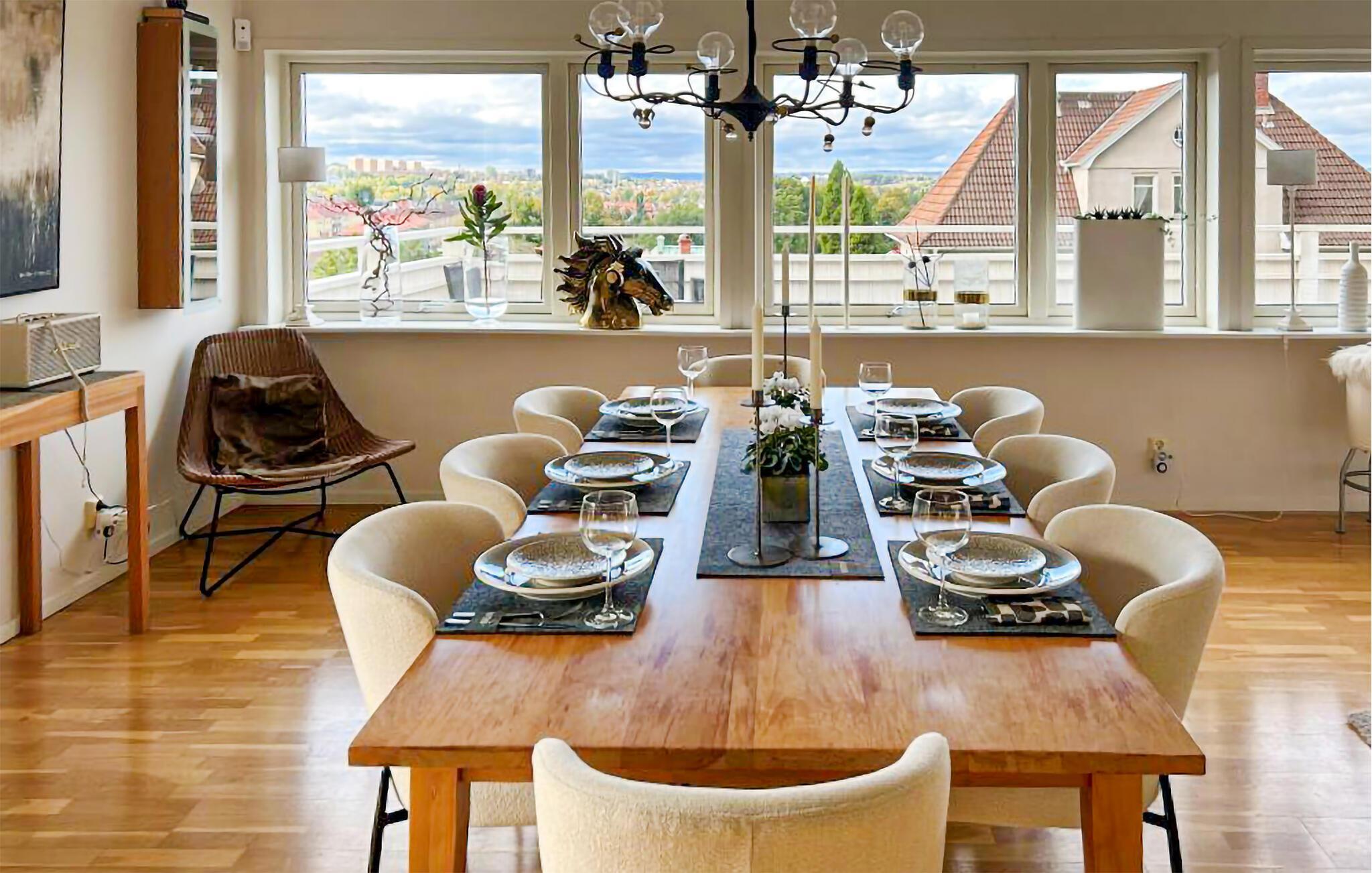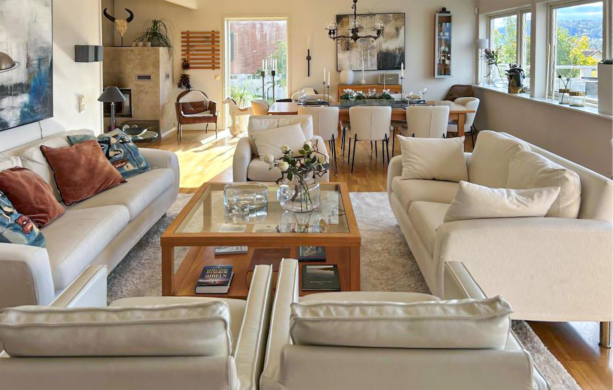 Med panoramaudsigt over Husqvarna og søen Vättern, ligger denne pragtfulde, rummelige villa, smagfuldt indrettet med høj standard. Den spændende planløsning tilbyder to store stuer, fire soveværelser og to badeværelser, hvoraf det ene har spabad. Terrassen og balkonen, sydvest vendte, giver begge en betagende udsigt over søen. Fine stier langs søen. Tæt på messecenter Elmia med en bred vifte af udstillinger. Ca. 40 km til Gränna-Vissingsö, High Chaparral ca. 60 km. Langrendspor med kunstsne og slalombakke med lift ca. 900 m fra huset.