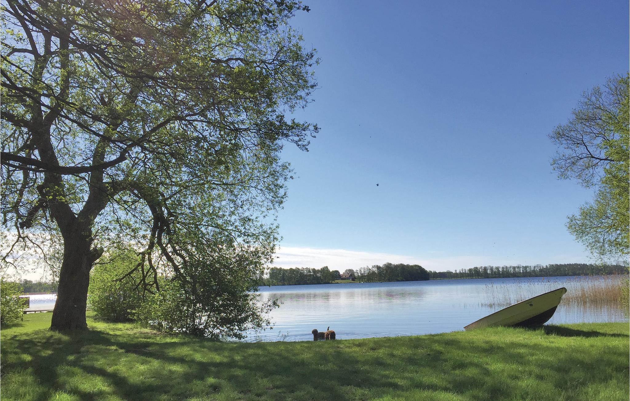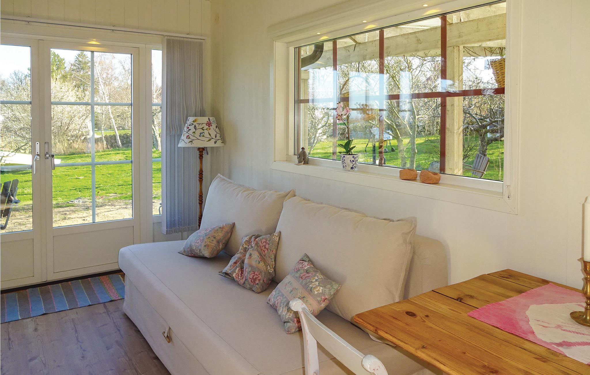 Dette feriehus ligger i fredelige omgivelser ved Kyrkviken, blandt enge, marker, skove og store frugtplantager på Ivö. Det lyse og hyggelige hus med alle moderne bekvemmeligheder har store glasdøre der åbner fra alrummet ud mod en af flere udendørs pladser med betagende udsigt over Ivösjön der glitrer mellem træerne, den gamle kirke nedenfor marken og på himlen svæver havørne eller andre rovfugle i vinden. Fra den indhegnede have med gamle frugttræer, bærbuske, blomster og stengårde tager der få minutter at gå ned til den beskyttede Kyrkviken hvor I kan bade, fiske eller sejle ud på Ivösjön. Ivö er en smuk ø med fine bøgeskove og en rig natur, her er meget vildt, mange fugle, frugt og bær. Desuden er ehr gangstier, grillpladser og badestrande. I kommer til øen med en færge, det tager fem minutter og det er gratis. I søen er der gode fiskemuligheder og her er et specielt klima som betyder at valnøddetræer som ellers mistrives i Sverige bliver store og er rigt bærende her. Der kan lejes båd og kajak hos ejer som også tilbyder undervisning i Yoga eller anden personlig træning. Ejer er af og til selv i sit hus (sammen med sin hund) der også ligger på grunden. Ivö Klack er en bjergtop med mange fossiler på øens nordlige del, hvor I med lidt held kan finde fossiler fra dinosauer eller Brattingborgspengar, som er centimeterstore kalkskaller, på hvis ene side der er et mønster der minder om et dødningehoved. Andre spændende seværdigheder på øen er Biskopskällaren, kaolinbruddet og de grottelignende formationer ved Ugnsmunnarna. Fra fastlandet er der ikke langt til Bäckaskogs slott og naturreservatet Kjugekull. Kristianstad, Bromölla og Sölvesborg nås på ca. 20 minutter i bil, her kan I købe ind, gå på museer, drikke en god kop kaffe på en cafe, spise mv. Lidt længere dagsture kunne være til Østerlen, Blekinge skærgård og Glasriket. Men Ivö er så dejlig at I næppe har lyst til at forlade den skønne ø.