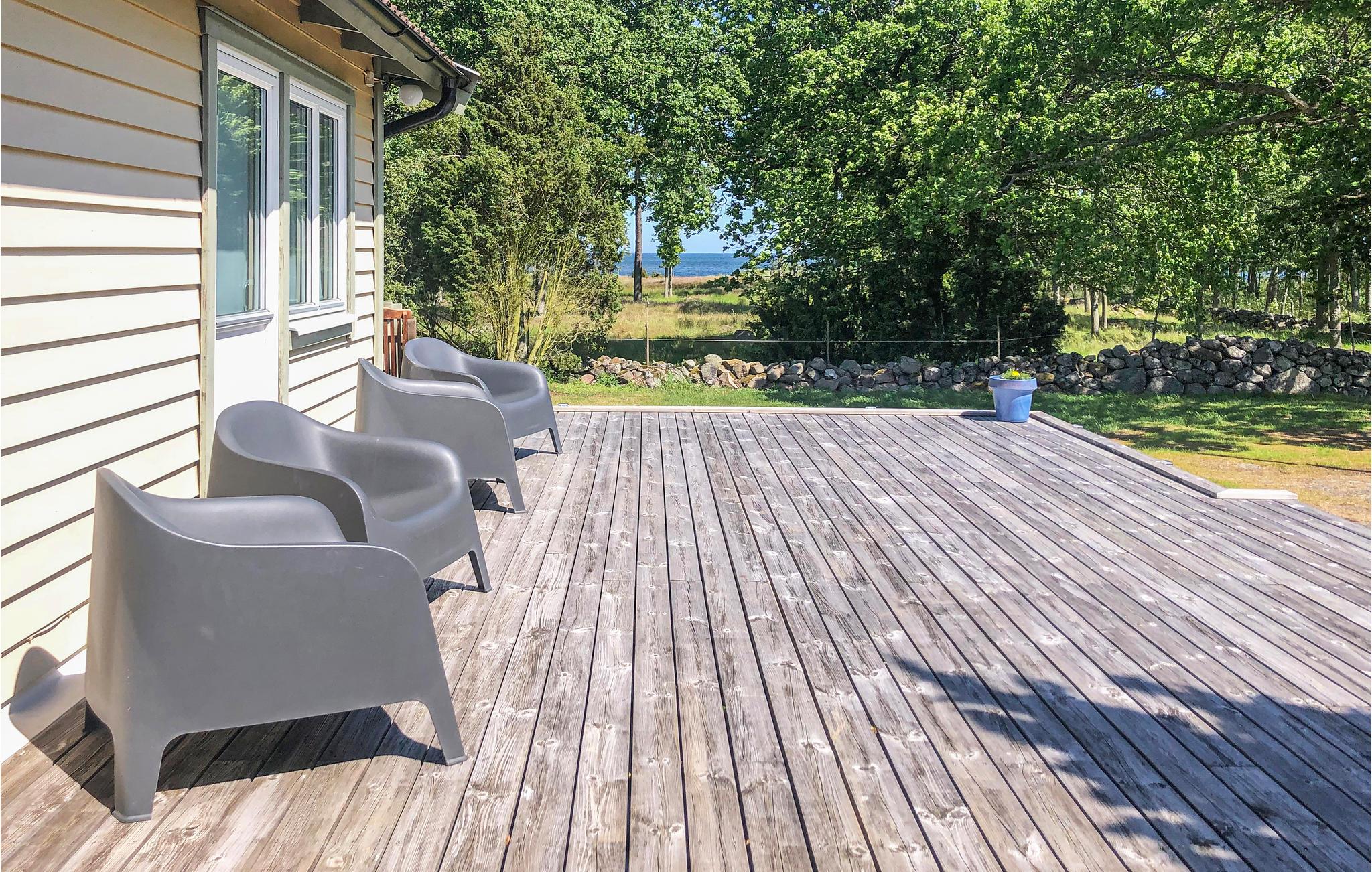 Fra husets opholdsstue kan I nyde udsigten til de grønne omgivelser og havet. Nyd morgenkaffen med en god bog på den lækre træterrasse, til lyden af fuglenes kvidren og havets brusen. På terrassen står havemøbler og grill til jeres rådighed, så I let kan nyde feriens måltider udendørs.