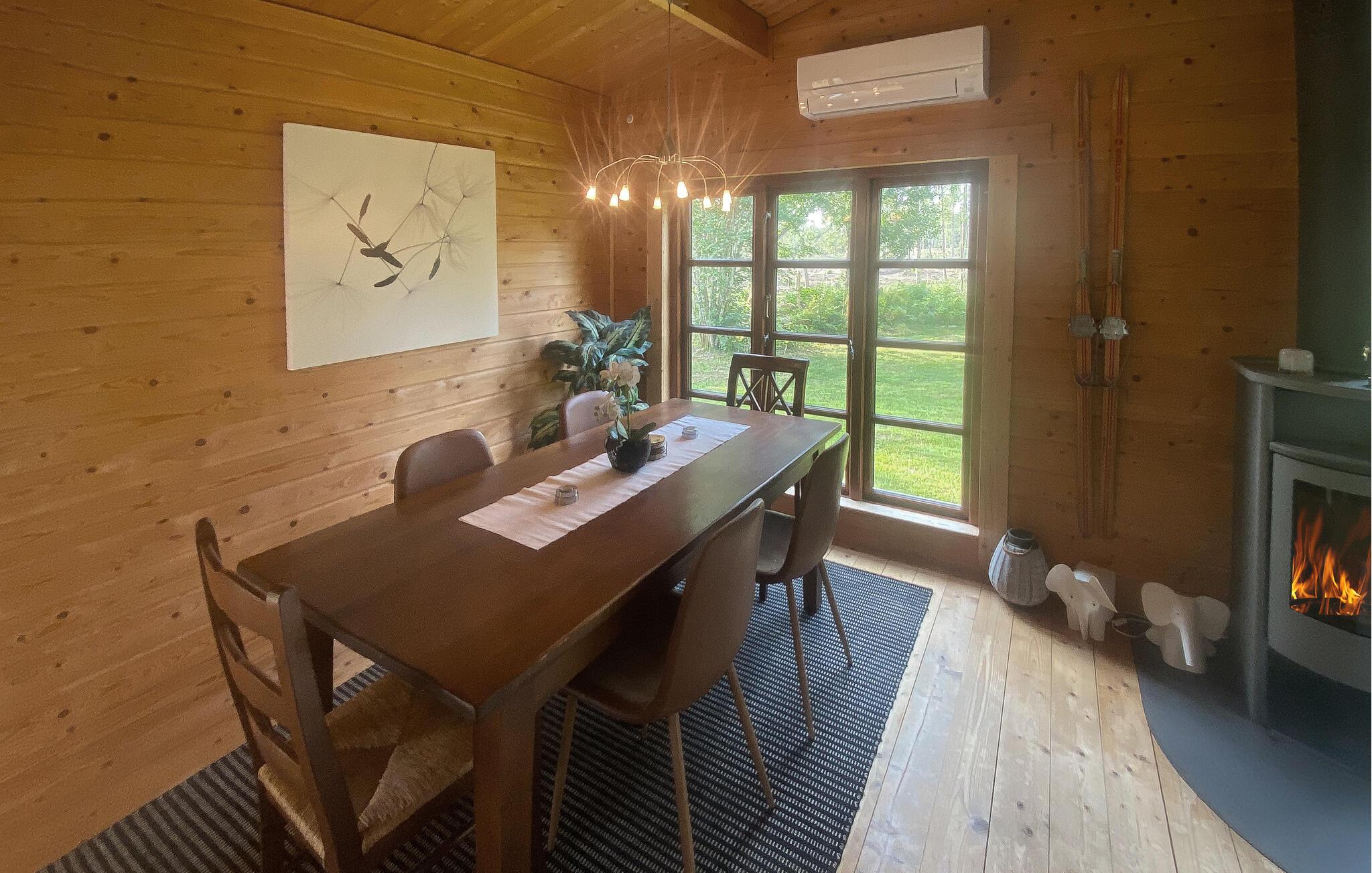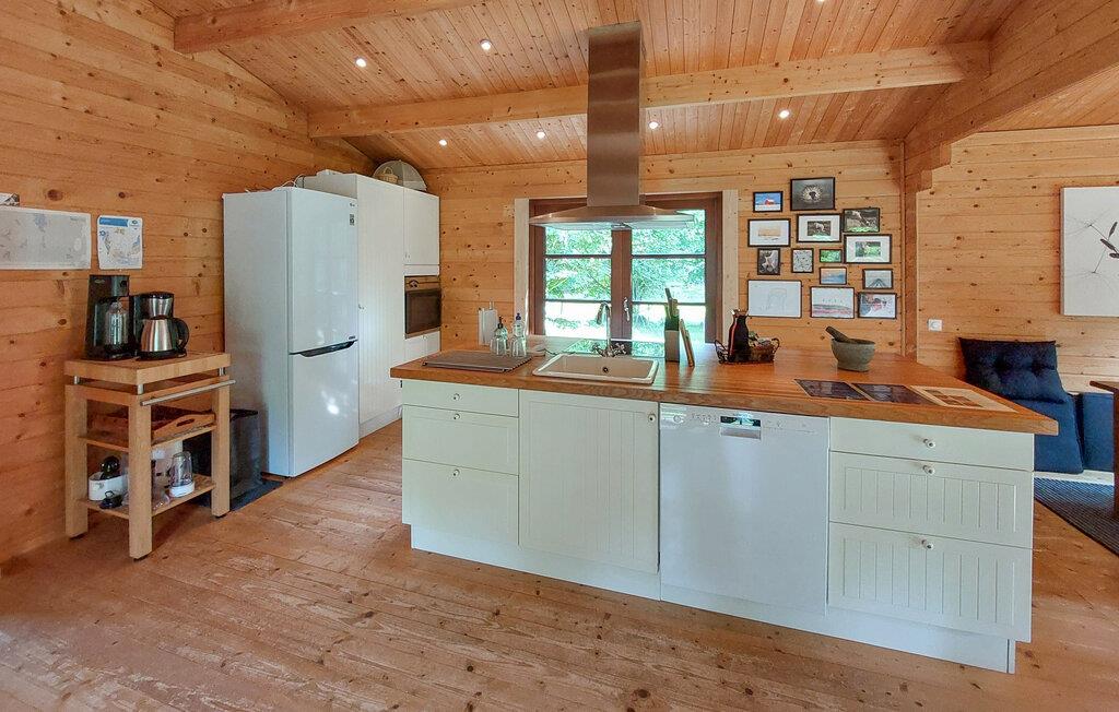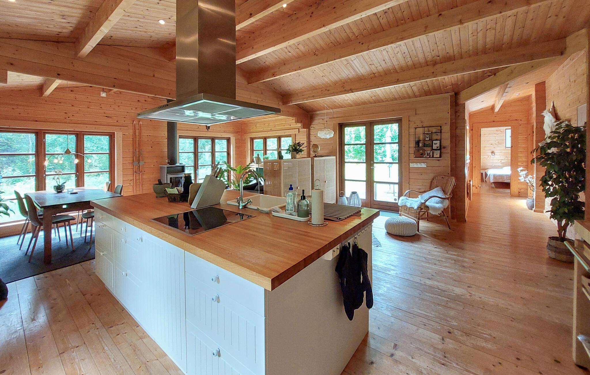 Dette charmerende hjem i lodge-stil tilbyder jer en unik naturoplevelse. Beliggende midt i en stille skov kan I nyde absolut privatliv og nyde omgivelsernes stilhed i fulde drag. Glæd jer til hyggelige timer i den store stue med brændeovn og hyggelige madlavningsaftener i det åbne køkken. Tag plads i den hyggelige spisestue og nyd jeres måltider med udsigt over det grønne.