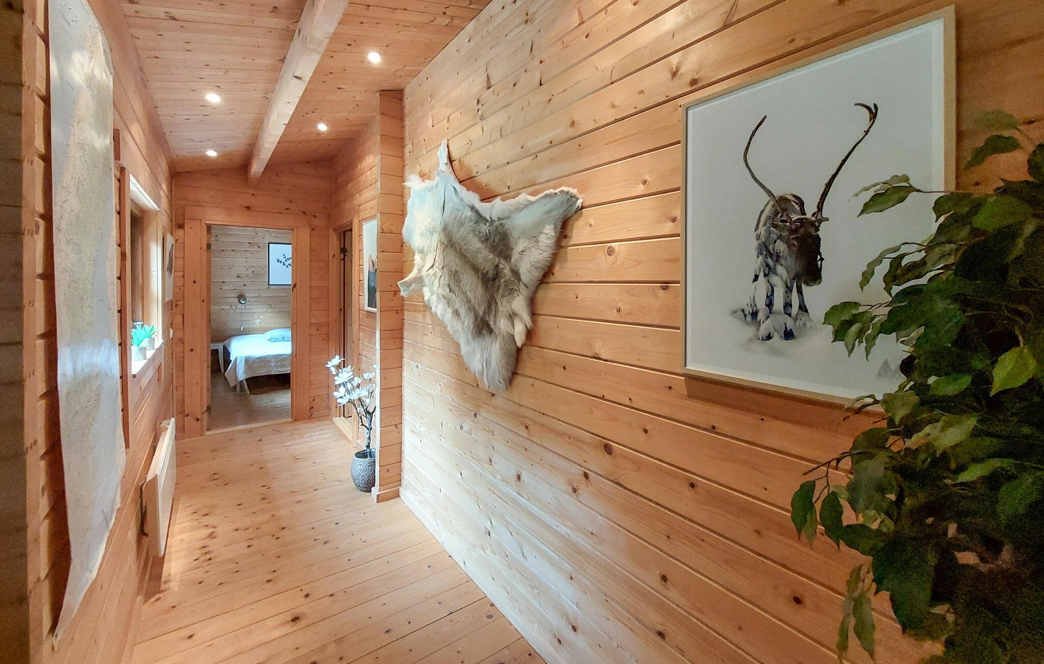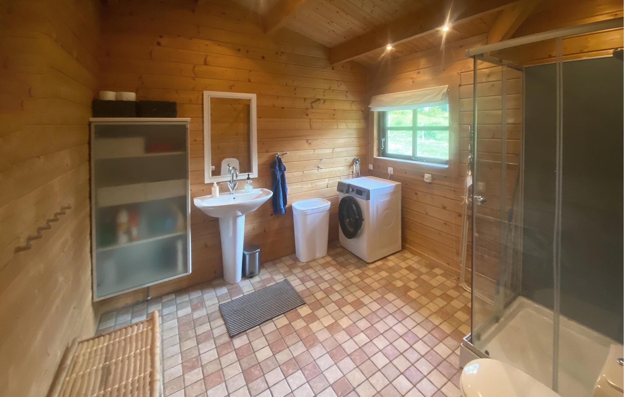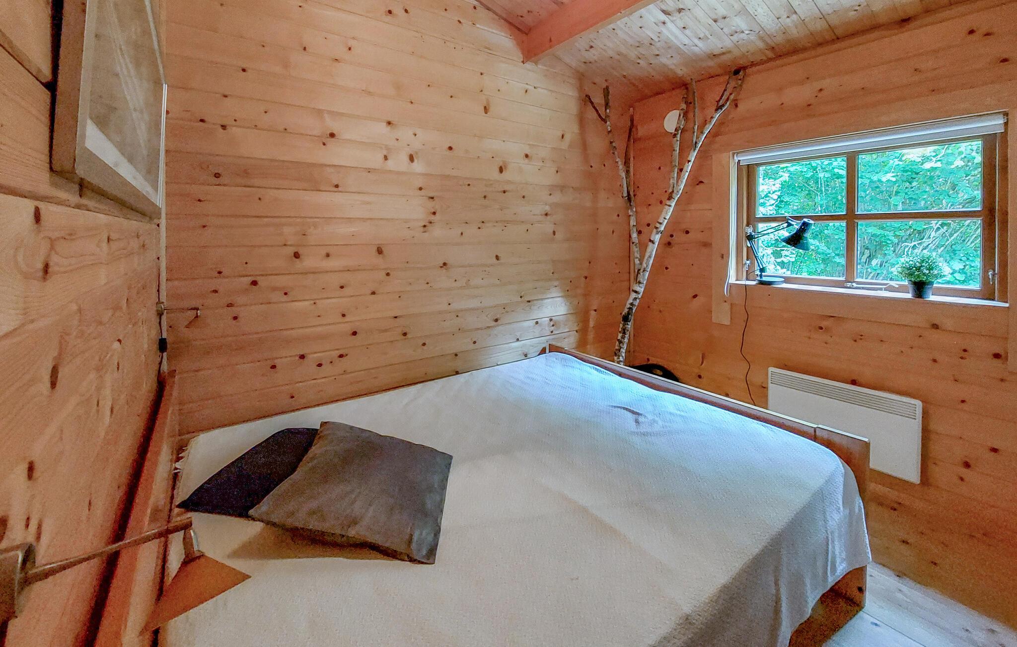 Dette charmerende hjem i lodge-stil tilbyder jer en unik naturoplevelse. Beliggende midt i en stille skov kan I nyde absolut privatliv og nyde omgivelsernes stilhed i fulde drag. Glæd jer til hyggelige timer i den store stue med brændeovn og hyggelige madlavningsaftener i det åbne køkken. Tag plads i den hyggelige spisestue og nyd jeres måltider med udsigt over det grønne.