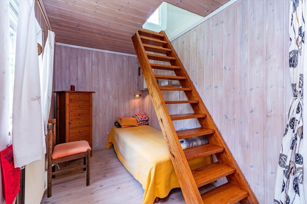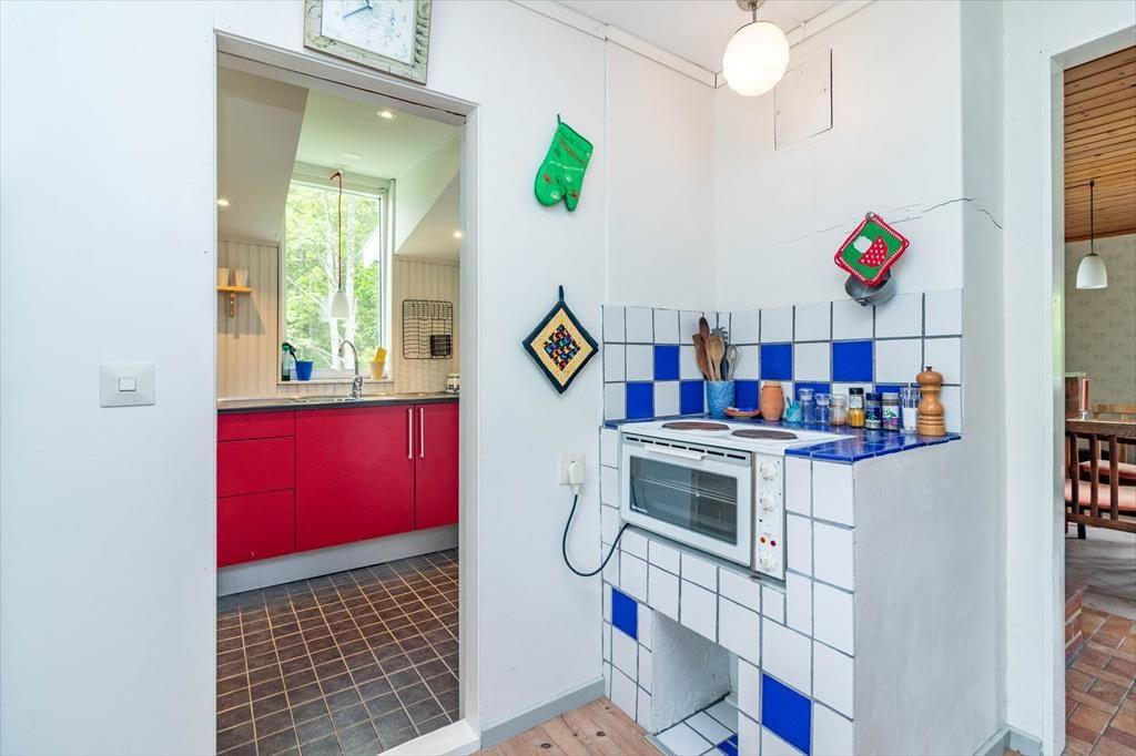 Feriehuset har et boligareal på 42 m². Når du træder ind i huset, kommer du direkte ind i opholdsområdet med lædersofa, lænestol, et lille spiseområde og en stor pejs. Herefter følger det todelte køkken, som blandt andet er udstyret med et 2-pladers komfur med lille ovn, køleskab med fryser, brødrister og kaffemaskine. Badeværelset med bruser og toilet ligger direkte i forlængelse af køkkenet. Fra opholdsområdet fører en trappe op til overetagen. Under trappen står der en enkeltseng. På overetagen findes et soveværelse med dobbeltseng. Få skridt fra hovedhuset ligger det ca. 22 m² store gæstehus. Når du træder ind i gæstehuset, kommer du ind i en lille entré med vaskemaskine og en lille hylde med kaffemaskine, kopper og glas. Til venstre ligger et toiletrum med forbrændingstoilet (håndvask kun med koldt vand). I den bagerste del ligger soveværelset med to enkeltsenge.