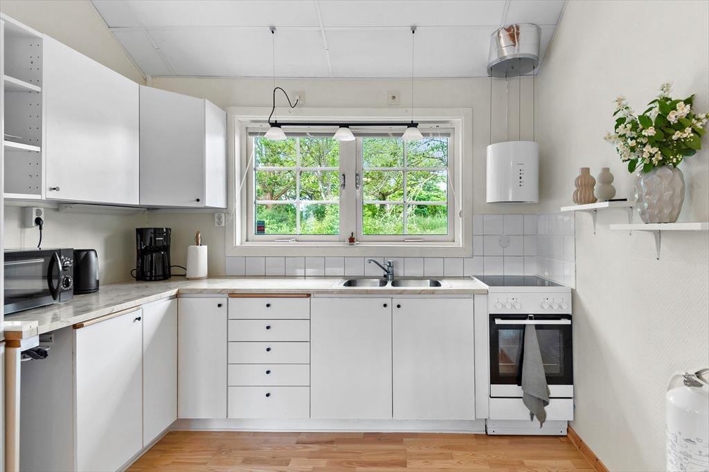 Det ca. 53 m² store feriehus med rummelig, åben stue/spisestue har plads til fire personer. Der er et soveværelse med to enkeltsenge og et soveværelse med en enkeltseng, som kan trækkes ud til en dobbeltseng. Køkkenet er udstyret med mikroovn, elektrisk komfur med keramiske kogeplader og ovn, køleskab med fryser, brødrister og kaffemaskine. Mellem køkkenet og opholdsstuen er der et ottekantet spisebord. Stuen er indrettet med sofa, lænestol og tv. Derudover er der et moderne badeværelse med brusekabine, toilet og håndvask. Huset har Wi-Fi, varmt og koldt vand og opvarmes med elvarme. Udenfor har gæsterne to siddeområder, begge med parasol.