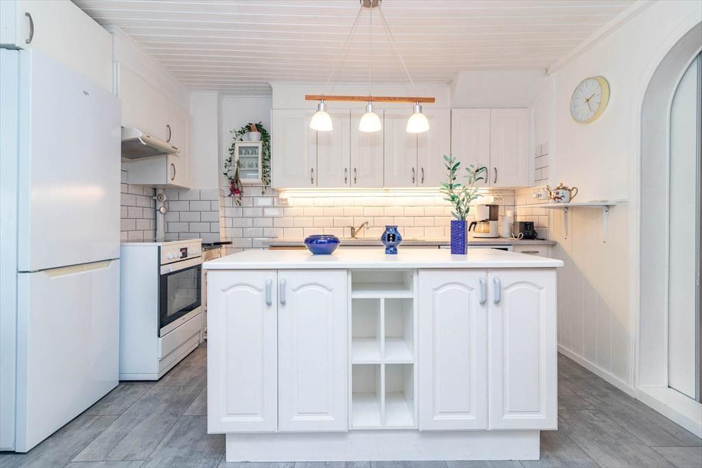 Det renoverede feriehus tilbyder dig 105 m² og god plads til op til 5 personer. Ved indgangen møder du en lille entré med garderobe. Badeværelset er udstyret med toilet, bruser og vaskemaskine. I køkkenet finder du alt, hvad du behøver til madlavning: 4-pladers keramisk kogeplade, ovn, emhætte, køle-/fryseskab, opvaskemaskine, mikroovn og kaffemaskine. I den hyggelige stue venter tre lænestole, en sofa samt en pejs, der sørger for varme og hygge. Herfra kommer du ind i vinterhaven, som bruges som spisestue og har direkte adgang til terrassen med havemøbler – et dejligt sted til fælles måltider i det fri.