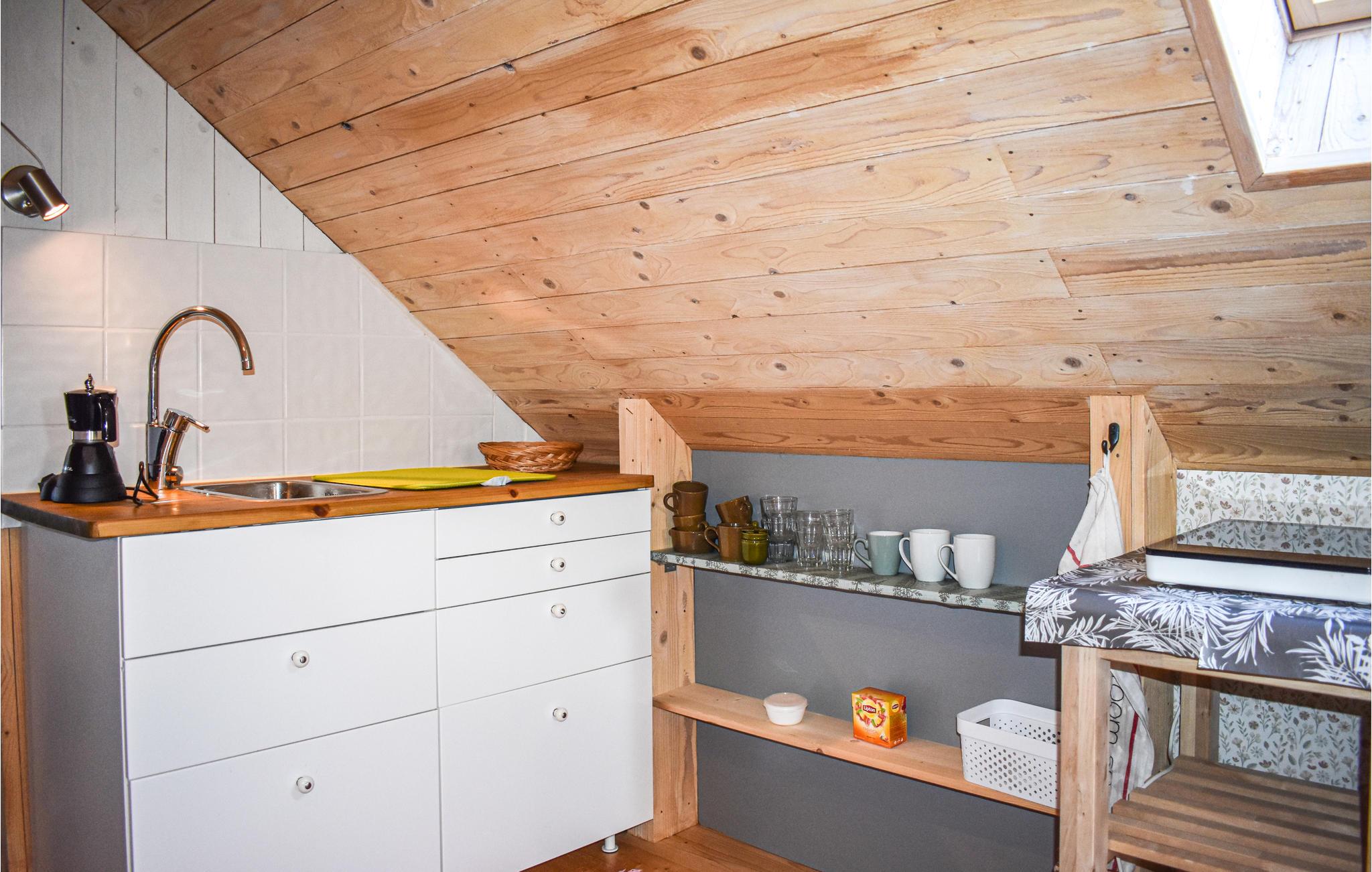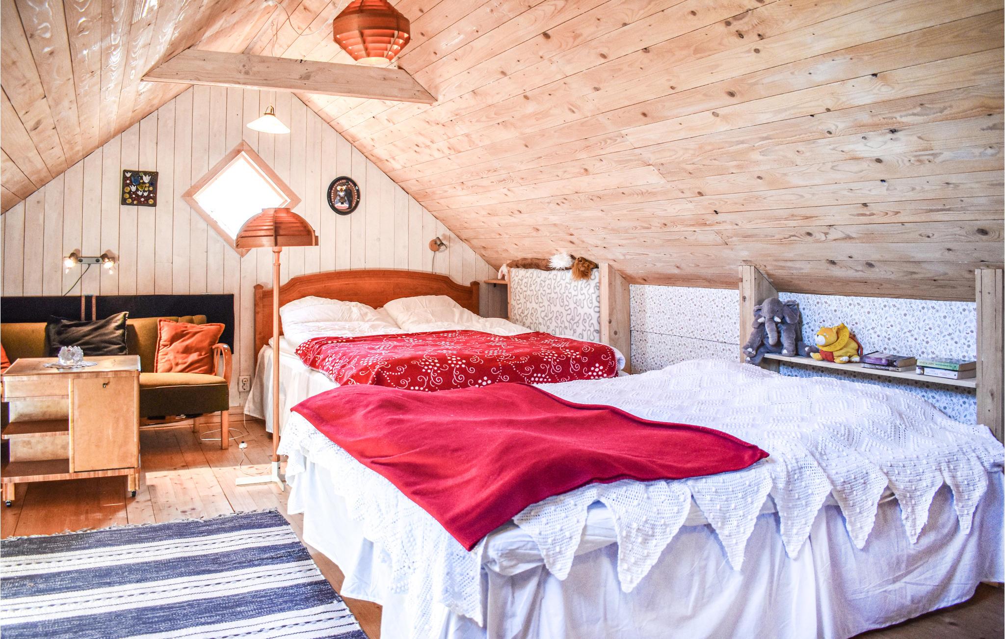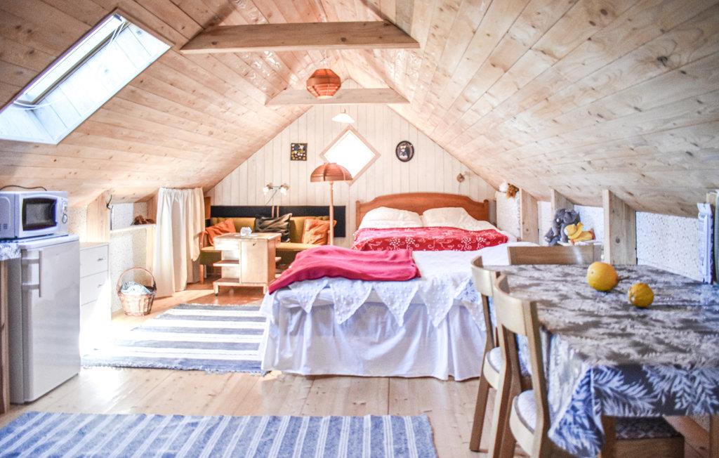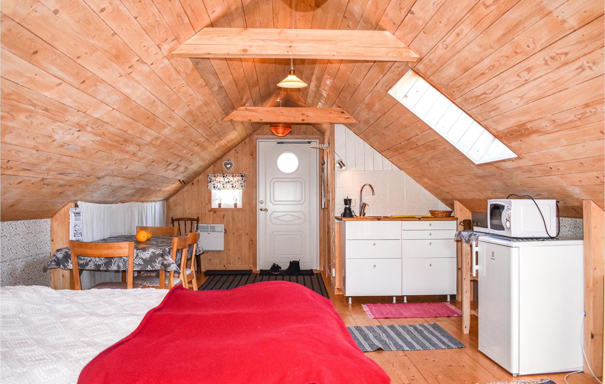 Træd ind i lejligheden på første sal i det røde hus og lad jer omfavne af den hyggelige atmosfære. Det åbne rum med synlige træbjælker, lyse vægge og rustikke detaljer udstråler varme og tryghed. Sove- og opholdsområdet flyder harmonisk sammen. Slap af i den hyggelige seng eller på den lille sofa med udsigt gennem tagvinduet til himlen. I det lille, funktionelle tekøkken kan I nemt tilberede jeres egne måltider.