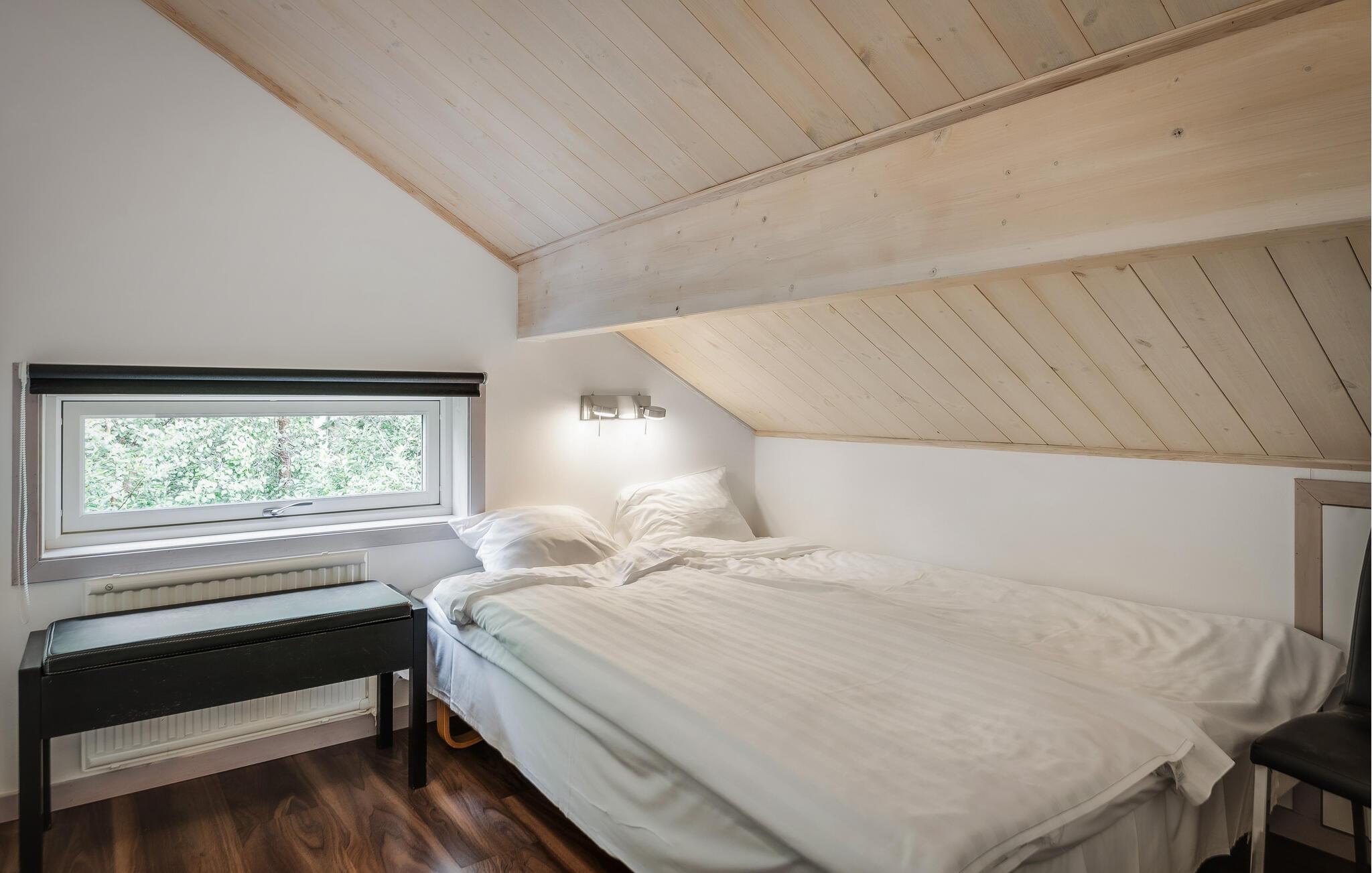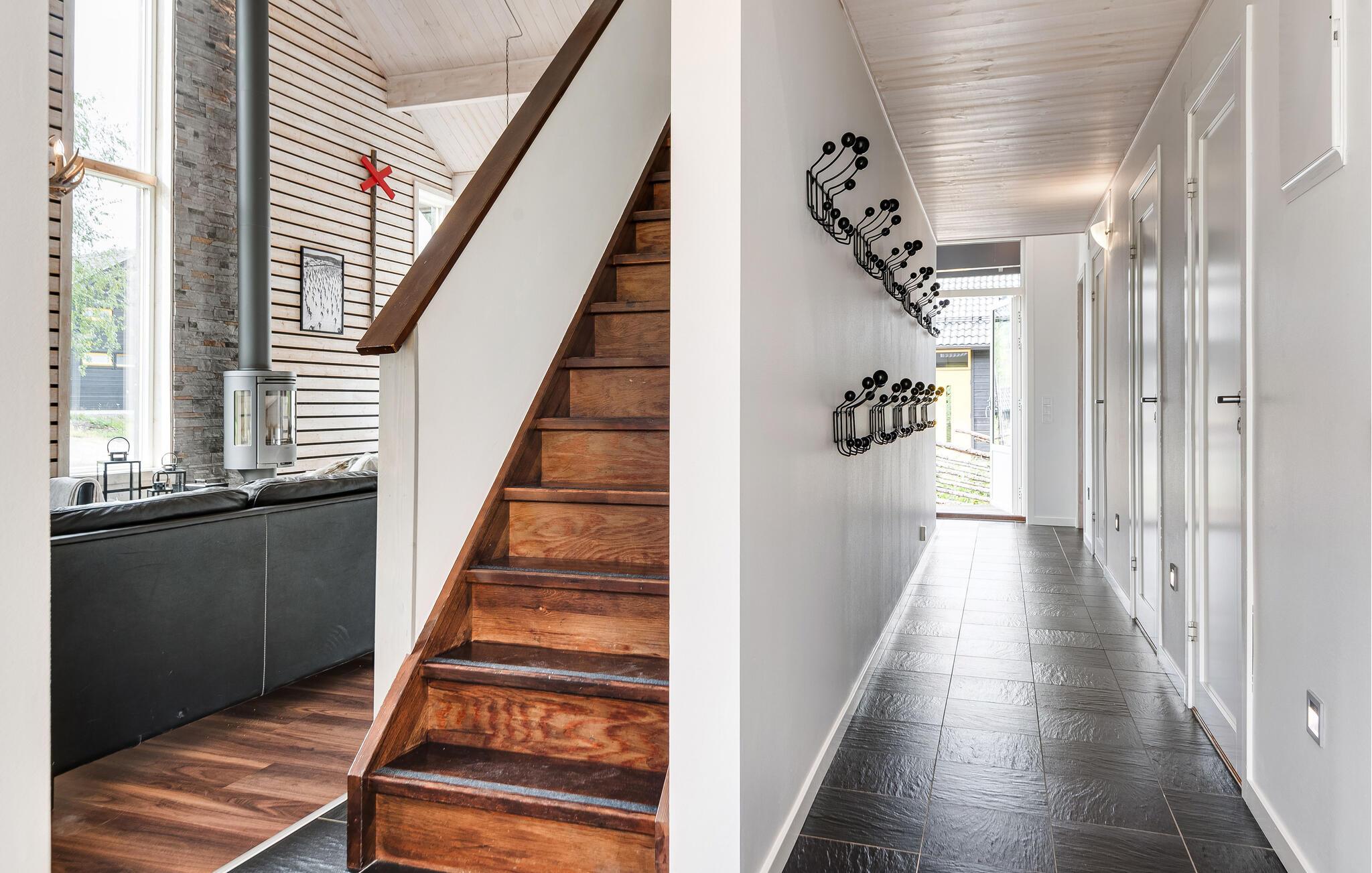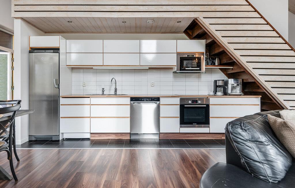 Dette feriehus tilbyder en rummelig, men varm atmosfære med masser af træ, højt til loftet og et åbent opholdsområde, der lægger op til socialt samvær. Nyd afslappende timer her med en kop kaffe, lyt til musik eller stream serier komfortabelt på sofaen. Tilbring aftenerne sammen med at spille kort eller brætspil, og slap af ved dagens slutning, mens pejsen knitrer sagte.