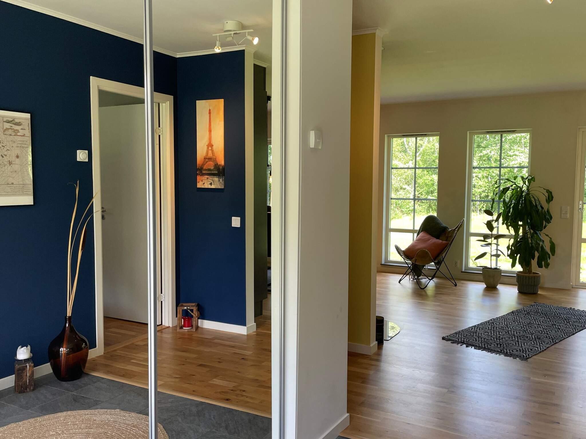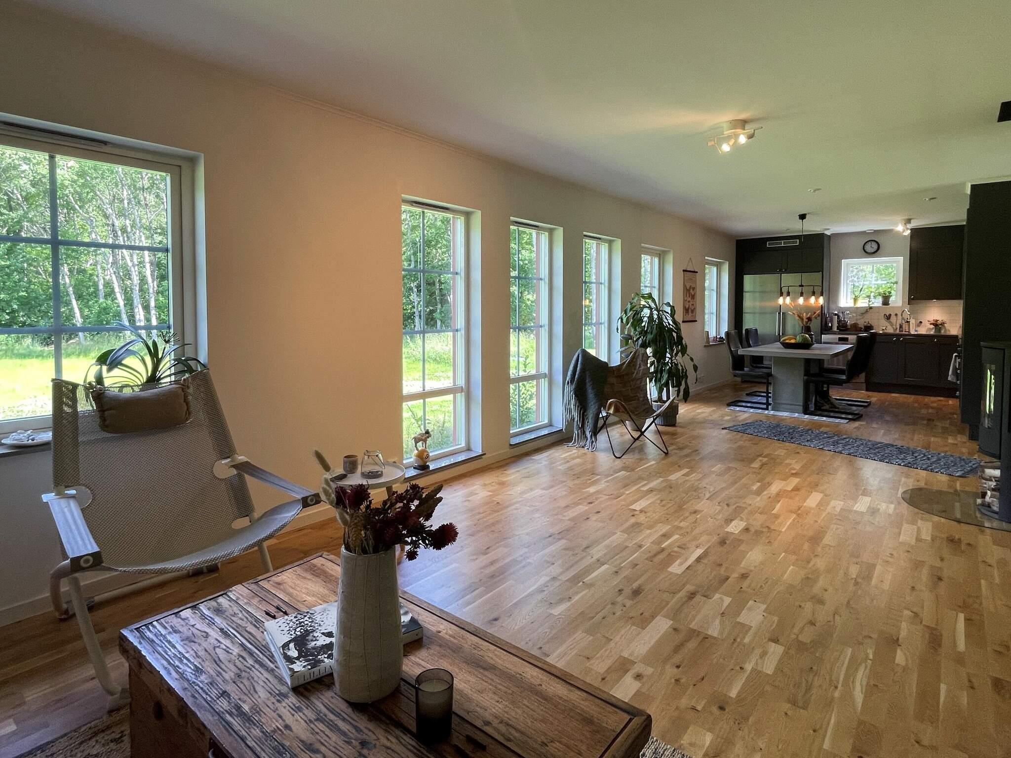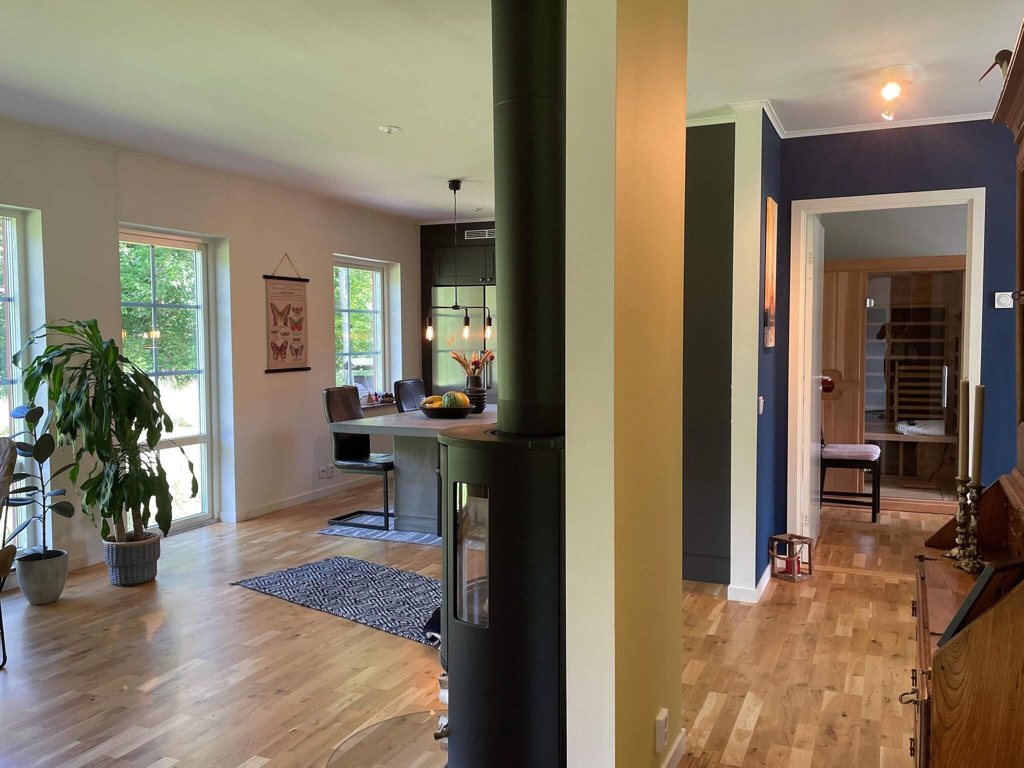 Entré från framsidan med rymlig hall med mycket förvaring. Två sovrum, ett med en 140cm säng och andra rummet med en våningssäng där underslafen är 120cm och övre 80cm. I det här rummet finns en härlig IR-bastu för 2 personer och ett enklare hemmagym för dig som vill träna på semestern. Det finns ett öppet kök med matplats och utsikt både mot husets kortsida samt baksida. Rymligt vardagsrum med stor TV 65” och soffa samt vilstol och även här stora härliga fönster mot baksidan.