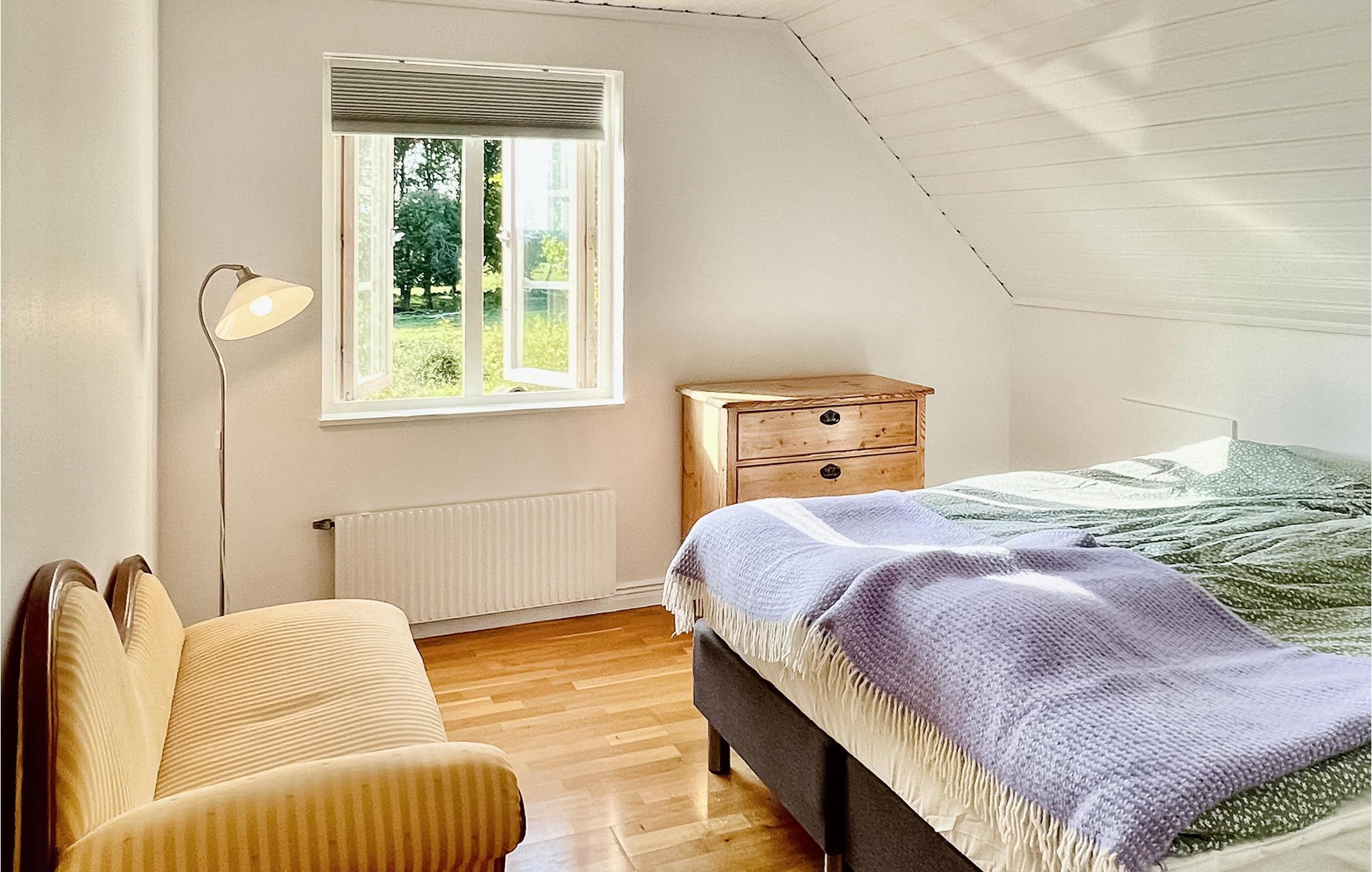 Kom og slap af i dette feriehus på en stor naturgrund omgivet af smuk natur. Den tidligere gård lægger op til en ferie med mange udendørs aktiviteter, her vil især lystfiskere få noget for pengene. Huset byder jer velkommen med hyggelig indretning og mange faciliteter. Nyd tiden sammen i en smagfuld atmosfære og glæd jer til atmosfæriske aftener ved pejsen. Tag jeres måltider med på terrassen eller haven, hvor I kan tilbringe dejlige timer i solen. Panoramaudsigten over det bølgende landskab er simpelthen vidunderlig.