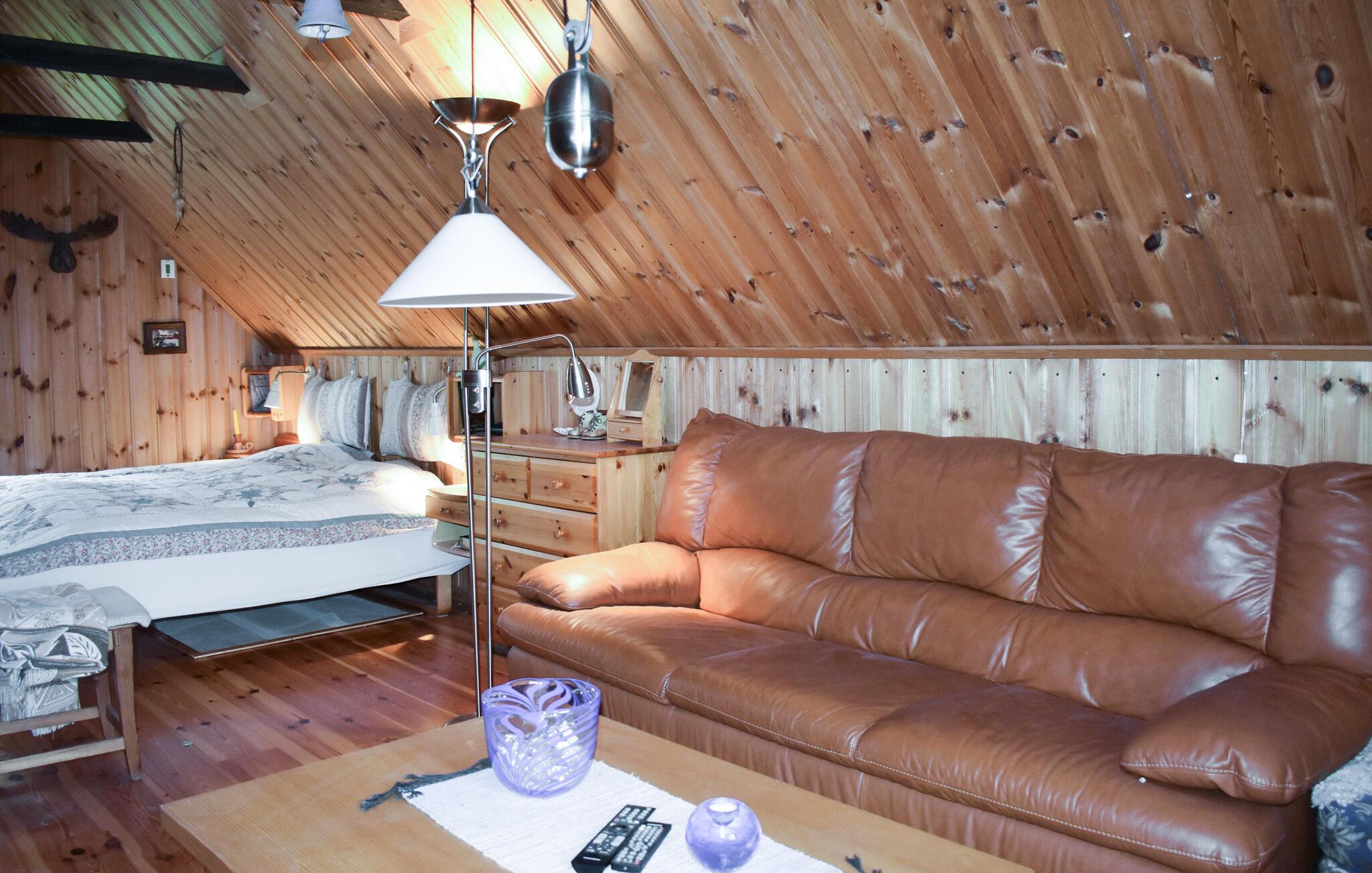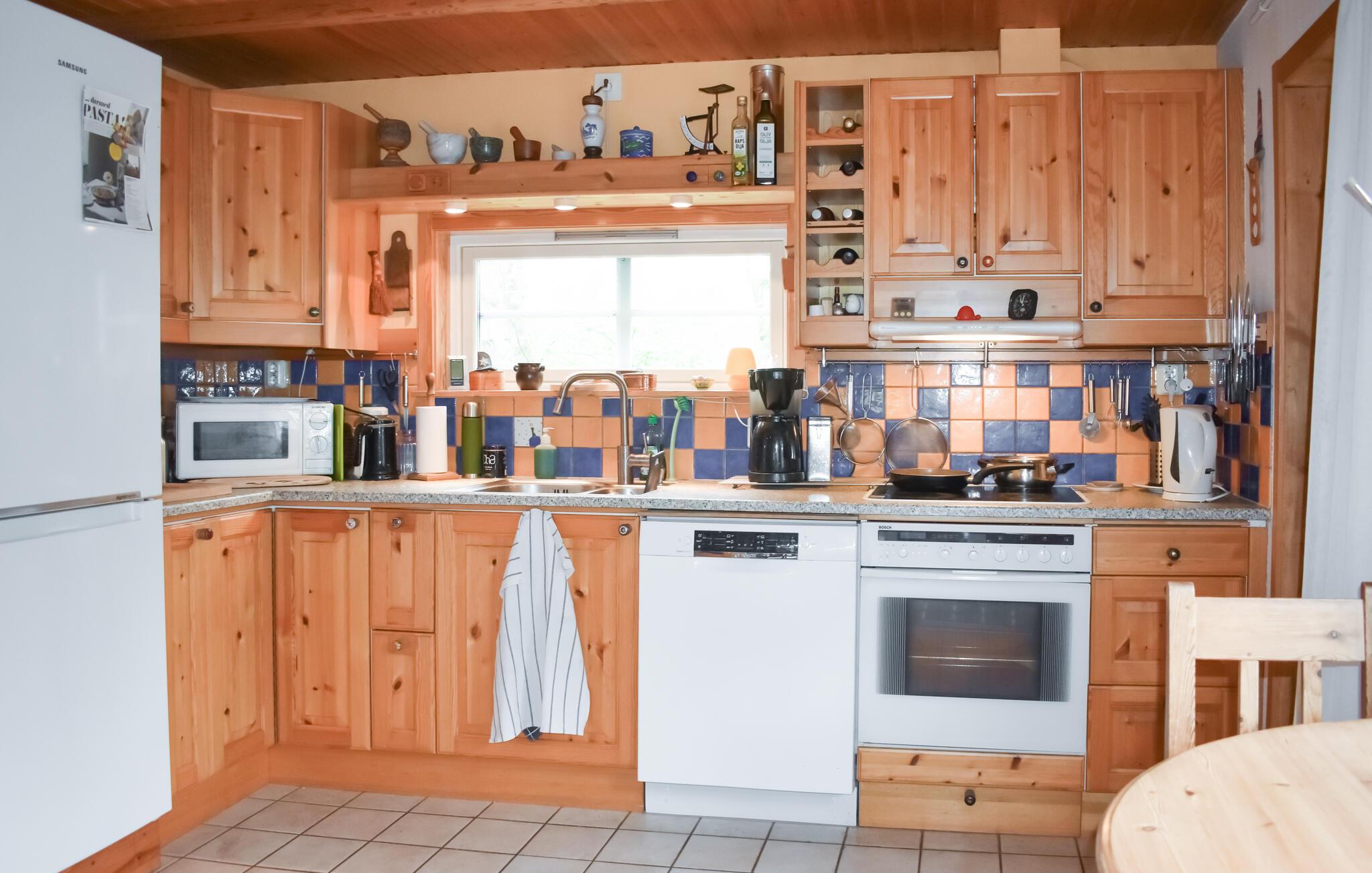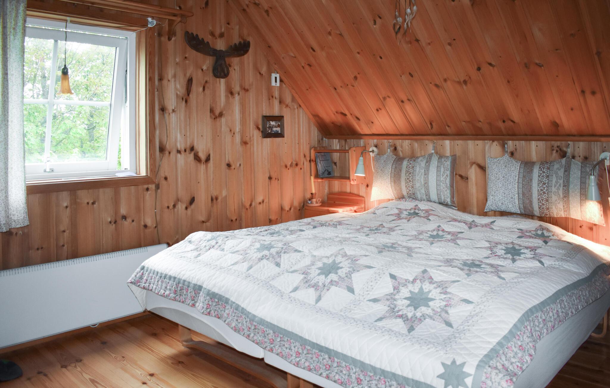 Velkommen til dette skønne træhus, der ligger midt det grønne på en stor grund, og hvor I får en charmerende base for årets familieferie. Indretningen fremtræder pænt og rustikt med kærlige detaljer i udsmykningen, der giver det indre et hjemligt strejf og gør det nemt at slappe af med det samme, I ankommer. Hvis vejret bider lidt fra sig, kan I tænde op i brændeovnen, og hvis I skal varmes endnu mere igennem, kan I forkæle jer selv med en lækker svedetur i saunaen efter aftensmaden.