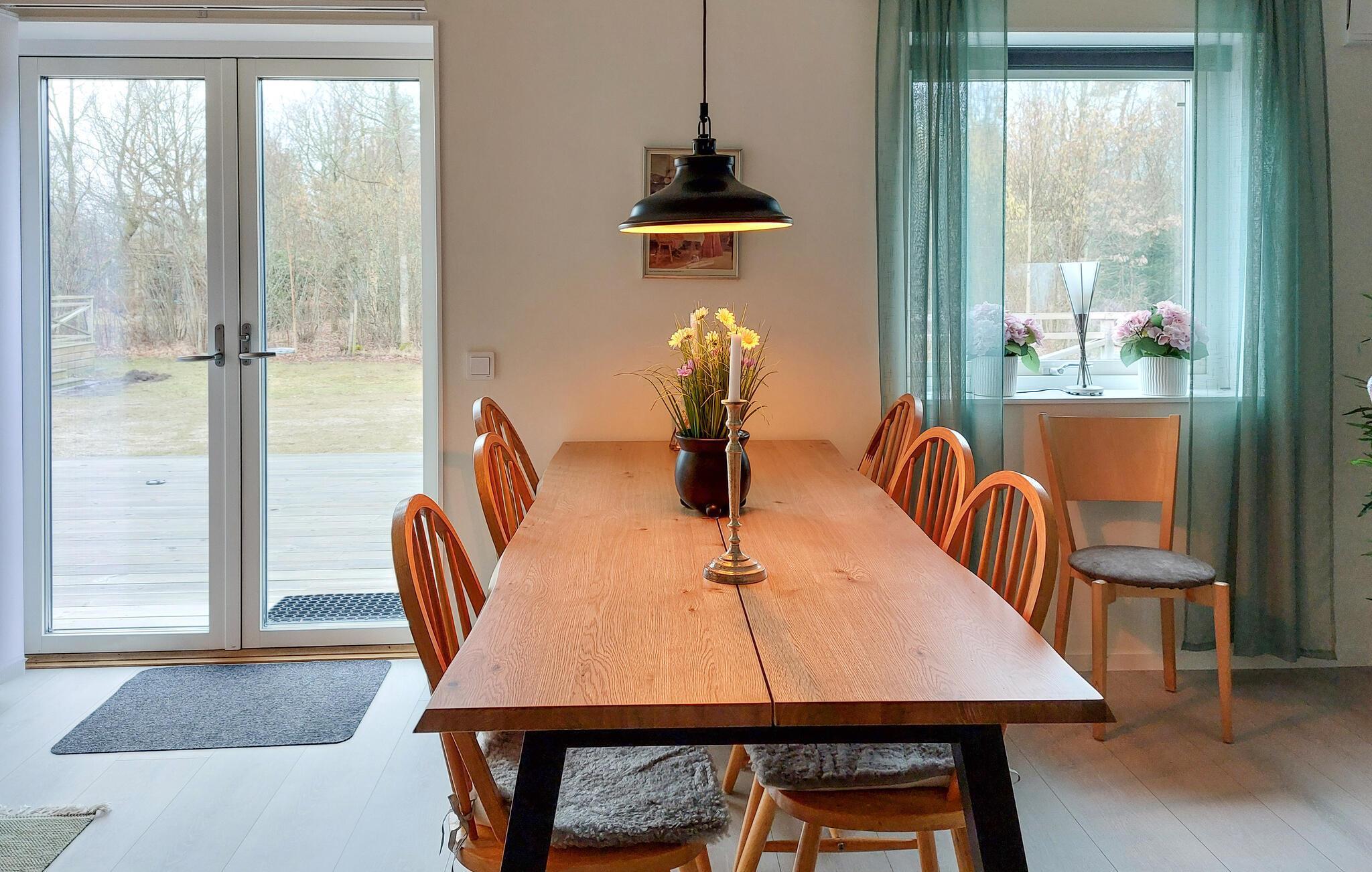 Brug den solrige træterrasse med havemøbler og grill til udendørs spisning eller afslapning i en liggestol. Den åbne have byder på plads til at lege, slappe af og nyde, omgivet af træer og natur. De store terrassedøre forbinder inde og udearealer på en behagelig måde.