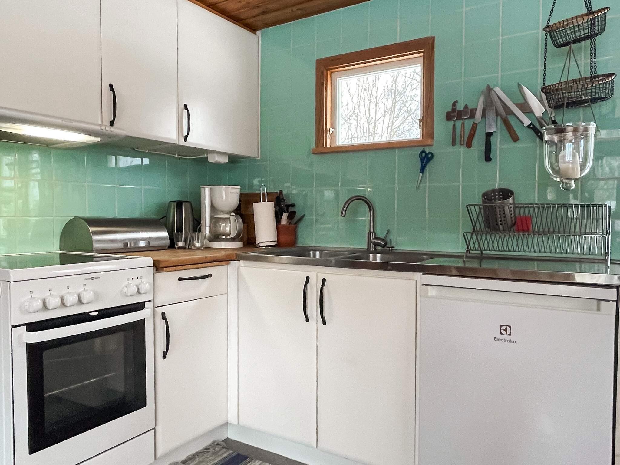 I den mindre stugan finns en våningssäng och två enkelsängar. Här finns även ett komplett badrum med dusch, wc, handfat och tvättmaskin. I förrådet finns frys och ett extra kylskåp.