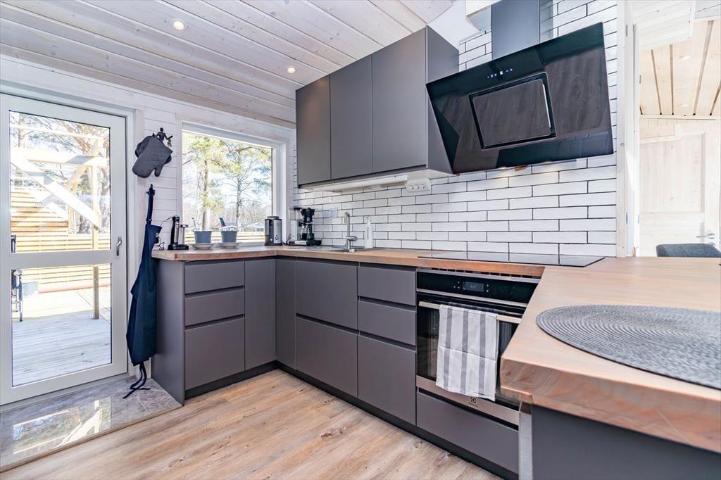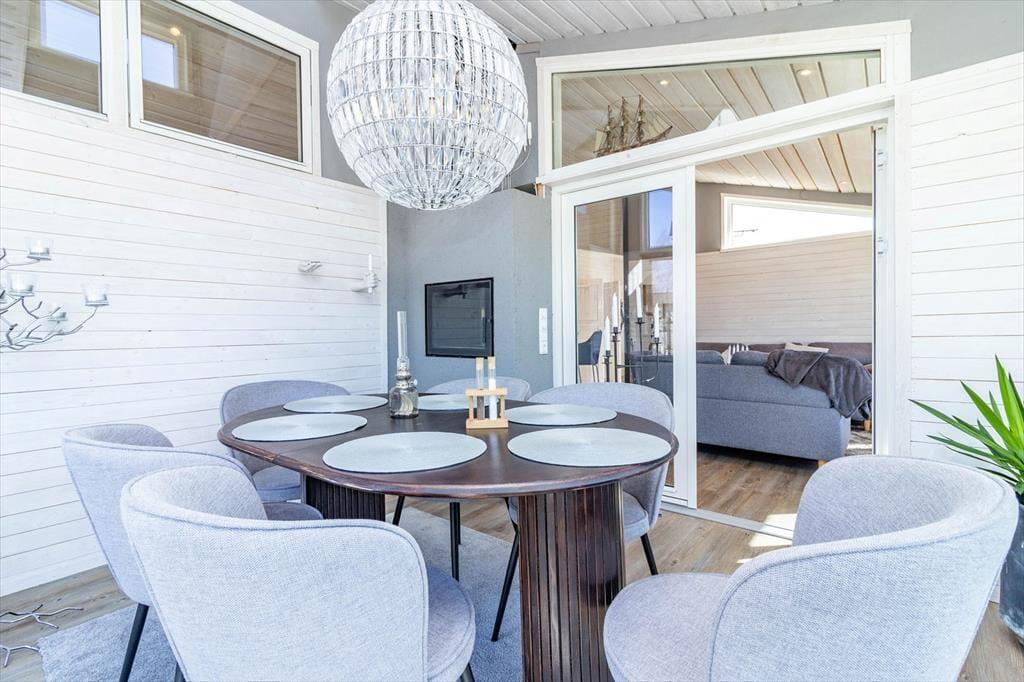 Det åbne opholds- og køkkenområde er indrettet med to sofaer, TV med Chromecast, brændeovn og gratis internet. Køkkenet er fuldt udstyret med induktionskogeplade med 4 zoner, ovn, køle-/fryseskab med ismaskine, vinkøleskab, opvaskemaskine, mikrobølgeovn og emhætte.