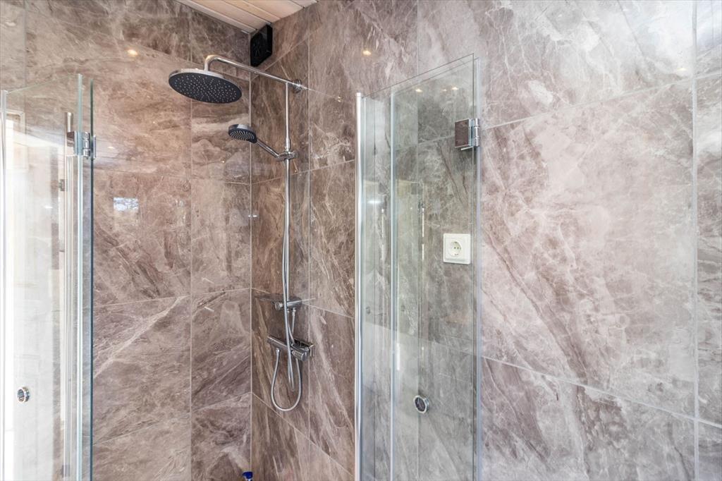 Badeværelset har bruser, toilet, vaskemaskine og tørretumbler. Herfra er der adgang til den store terrasse på ca. 200 m² med jacuzzi, som du kan bruge gratis døgnet rundt, havemøbler og to solsenge. Der findes desuden en pergola med spiseplads til udendørs måltider.