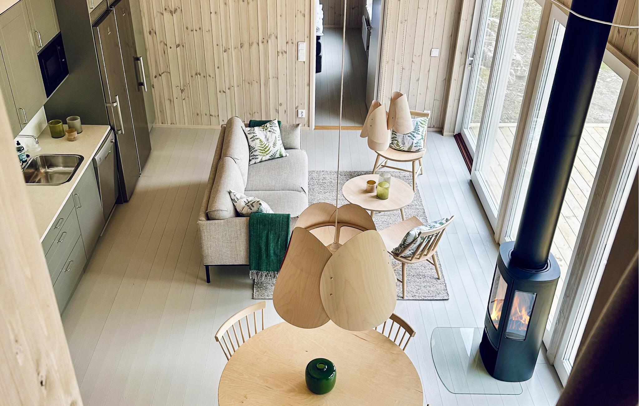 Træd indenfor og bliv betaget af den åbne stue med gulv-til-loft-vinduer. Lyse træpaneler og omhyggeligt udvalgte møbler skaber en rolig atmosfære. Brug det veludstyrede køkken til fælles måltider, og slap derefter af ved brændeovnen, mens I nyder det omkringliggende grønt. Slap af med en bog i det komfortable sofahjørne eller planlæg jeres næste udflugt.