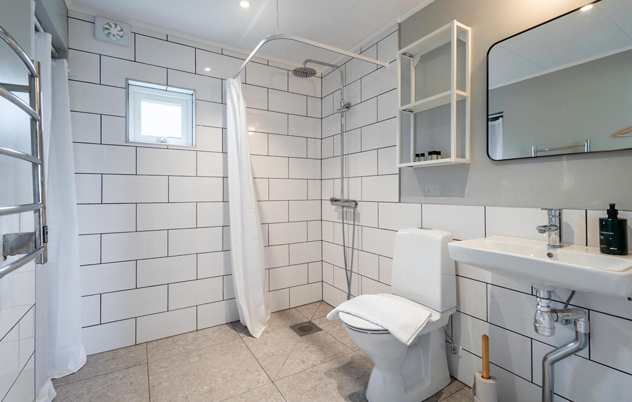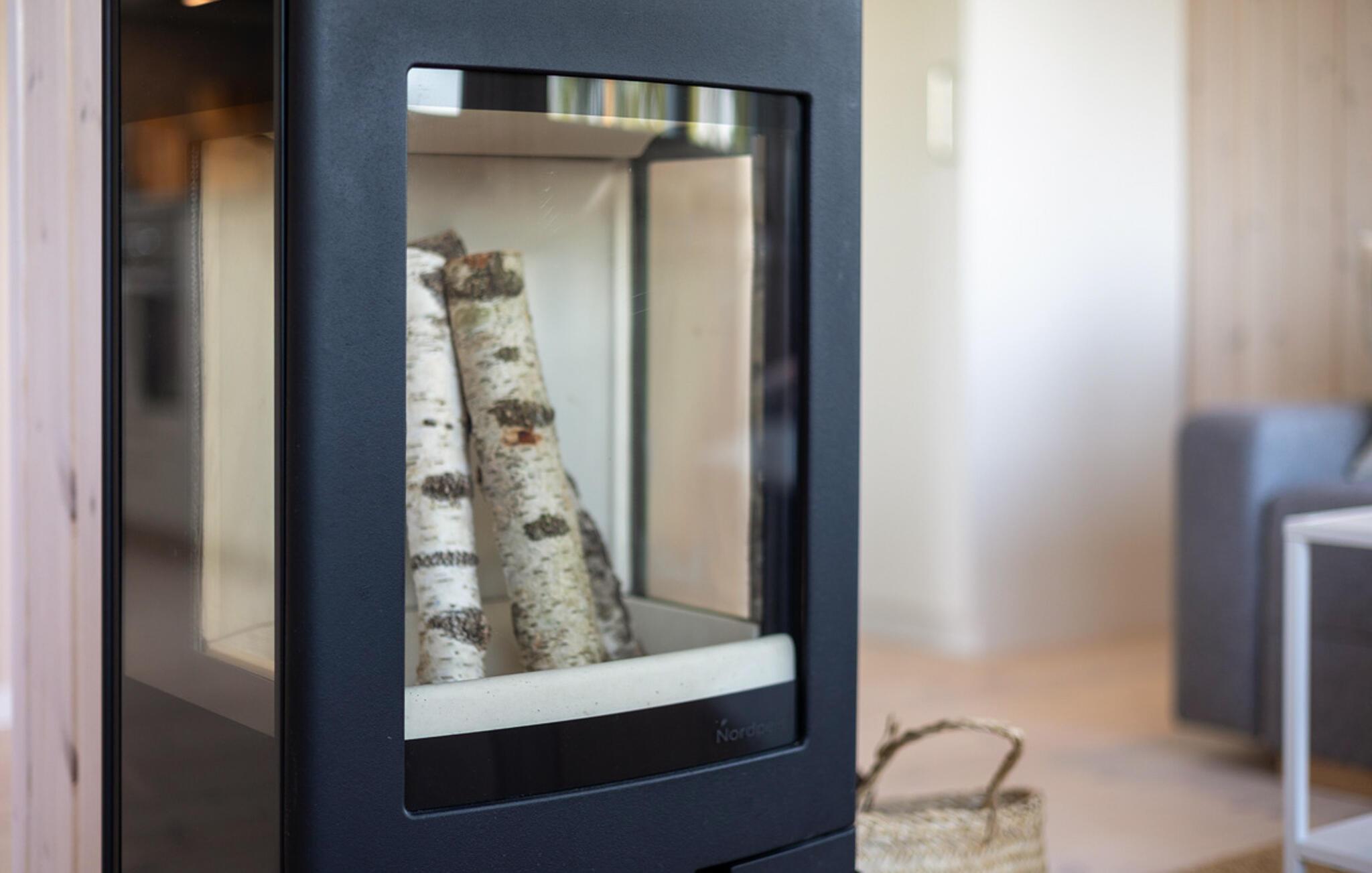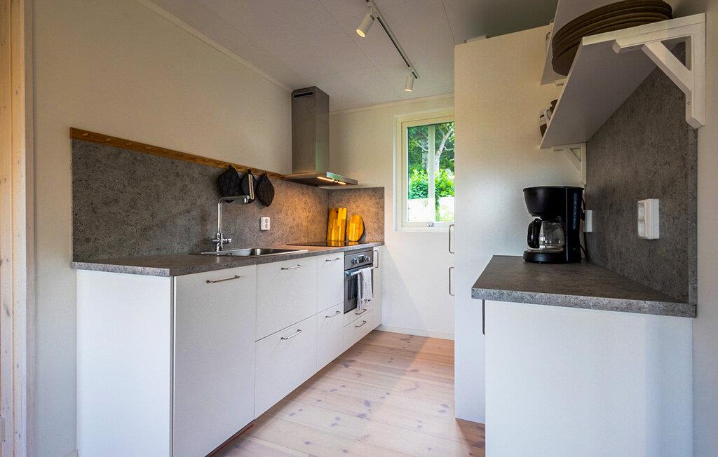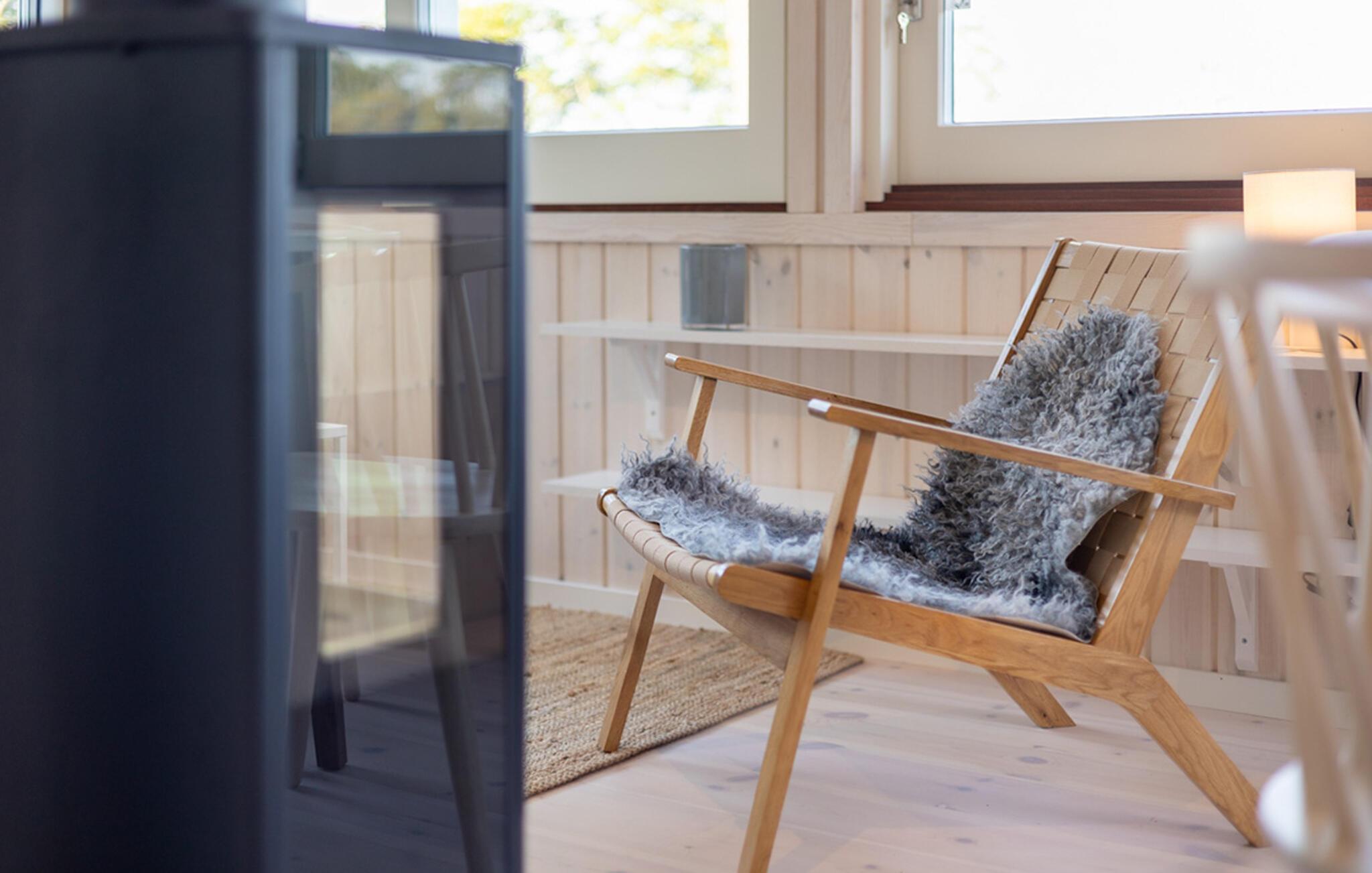 Træd ind i den indbydende stue med de store vinduer, der åbner ud mod det omkringliggende landskab. slå jer ned godt til rette i sofaen og nyd den knitrende ild i den fritstående brændeovn, der fylder rummet med behagelig varme. Spiseområdet med sine lyse træmøbler er perfekt til at dele måltider, mens det moderne køkken giver jer mulighed for at lave mad, selv på ferien.