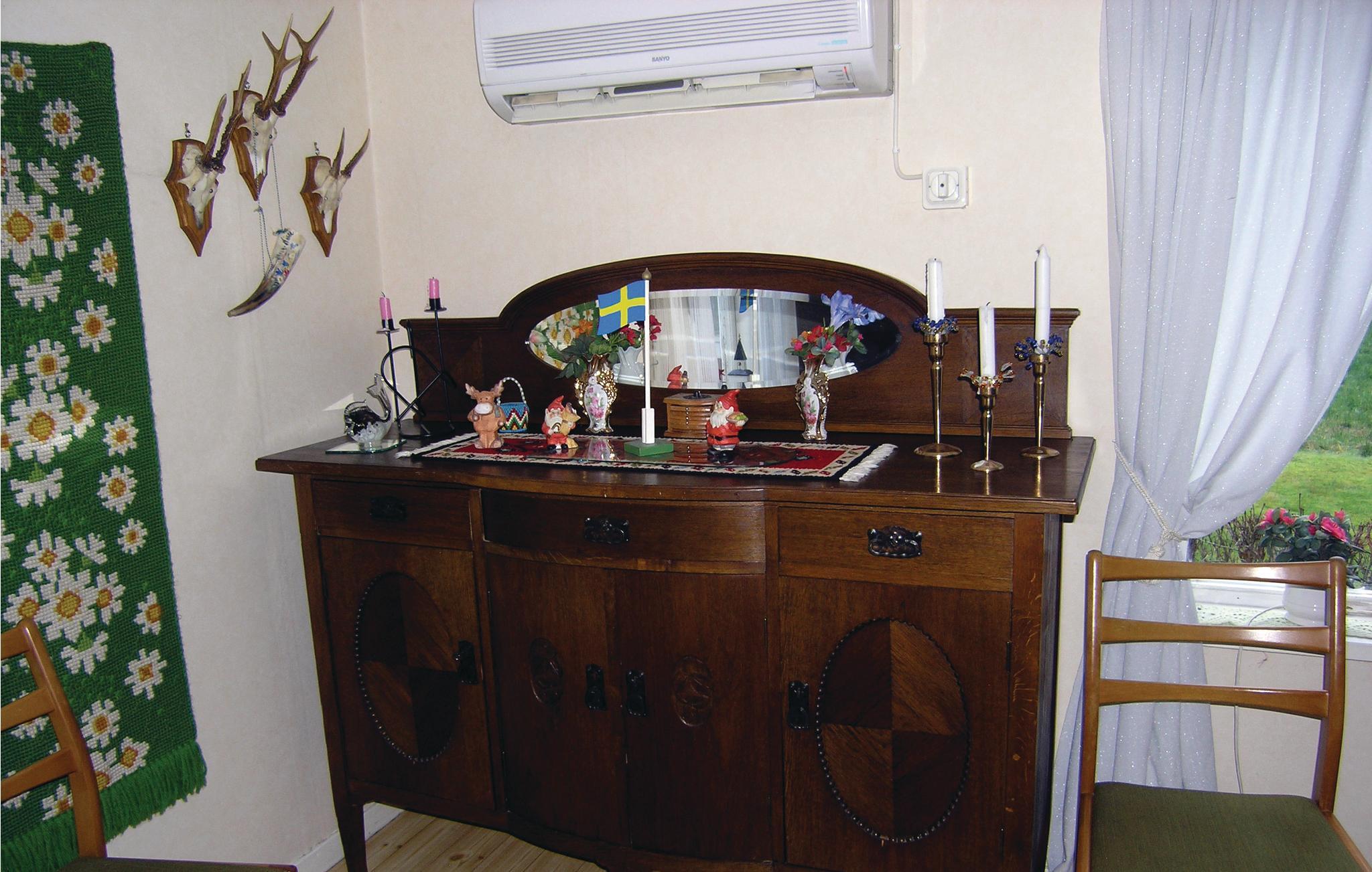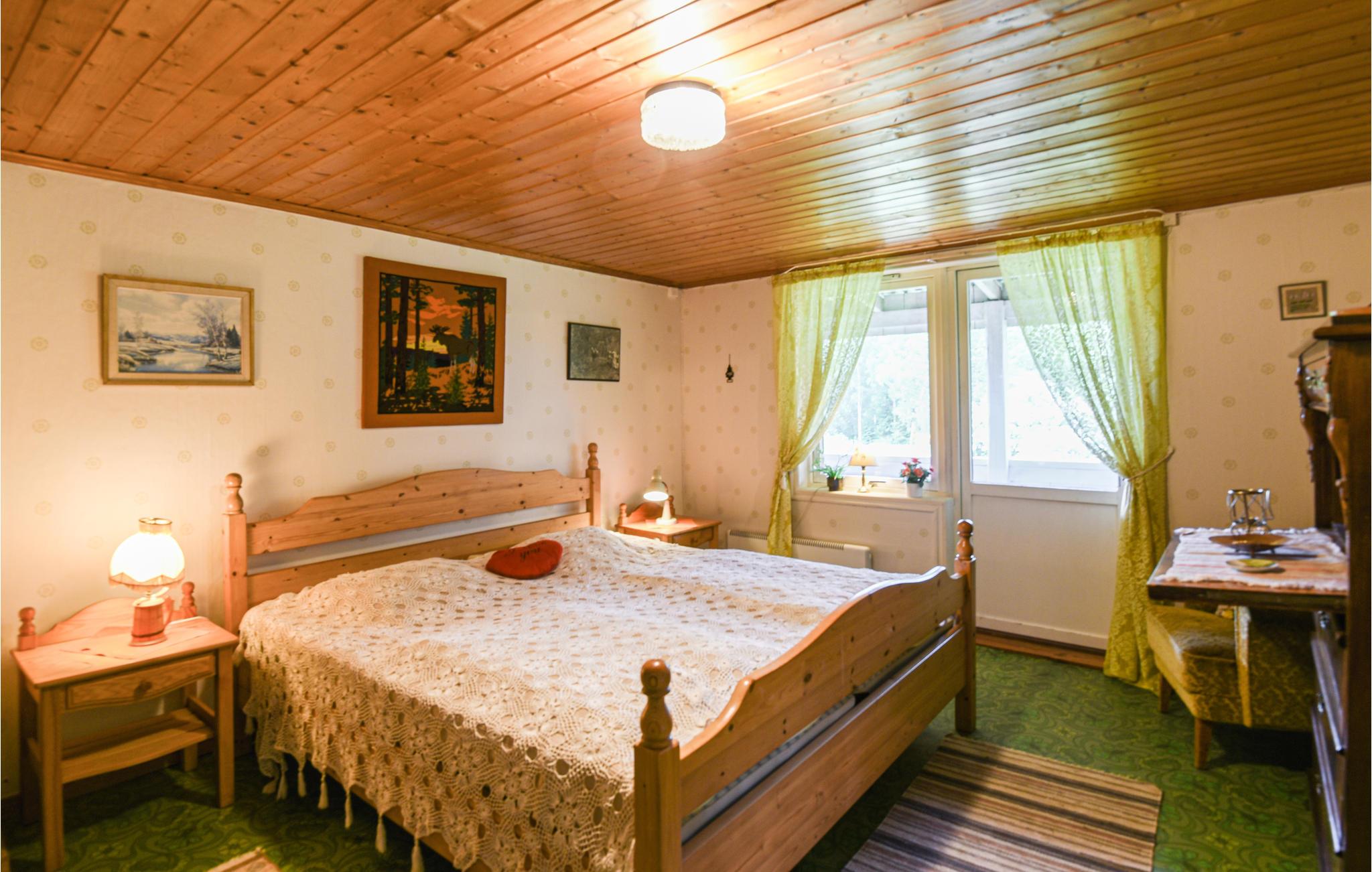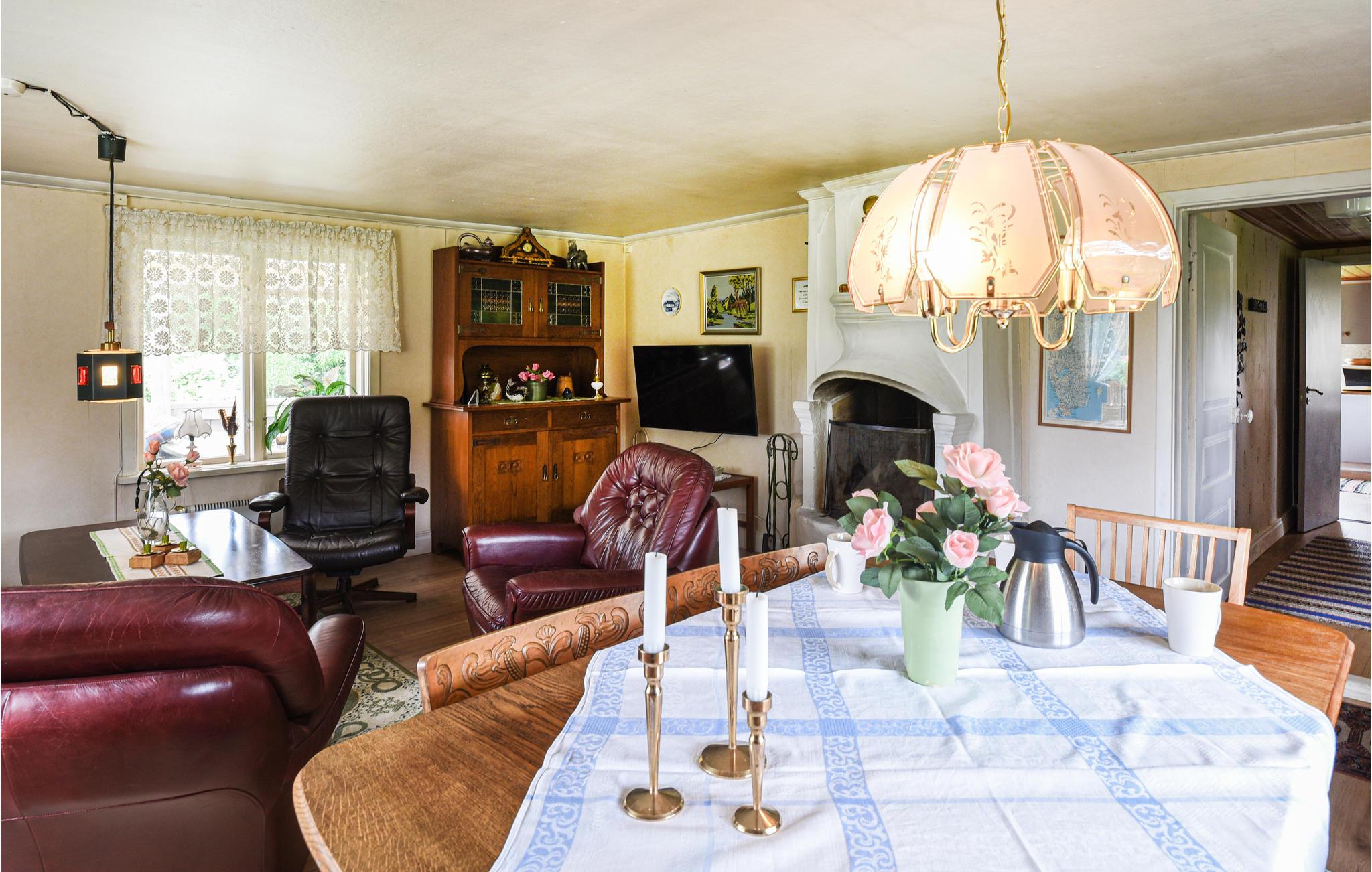 Udsigt over dam med bademulighed og båd på grunden. Feriehuset ligger lige uden for Ryd i nærheden af Jönköping, men i Västergötland. I 2021 er der foretaget flere renoveringer på boligen, herunder nye gulve i flere af rummene.