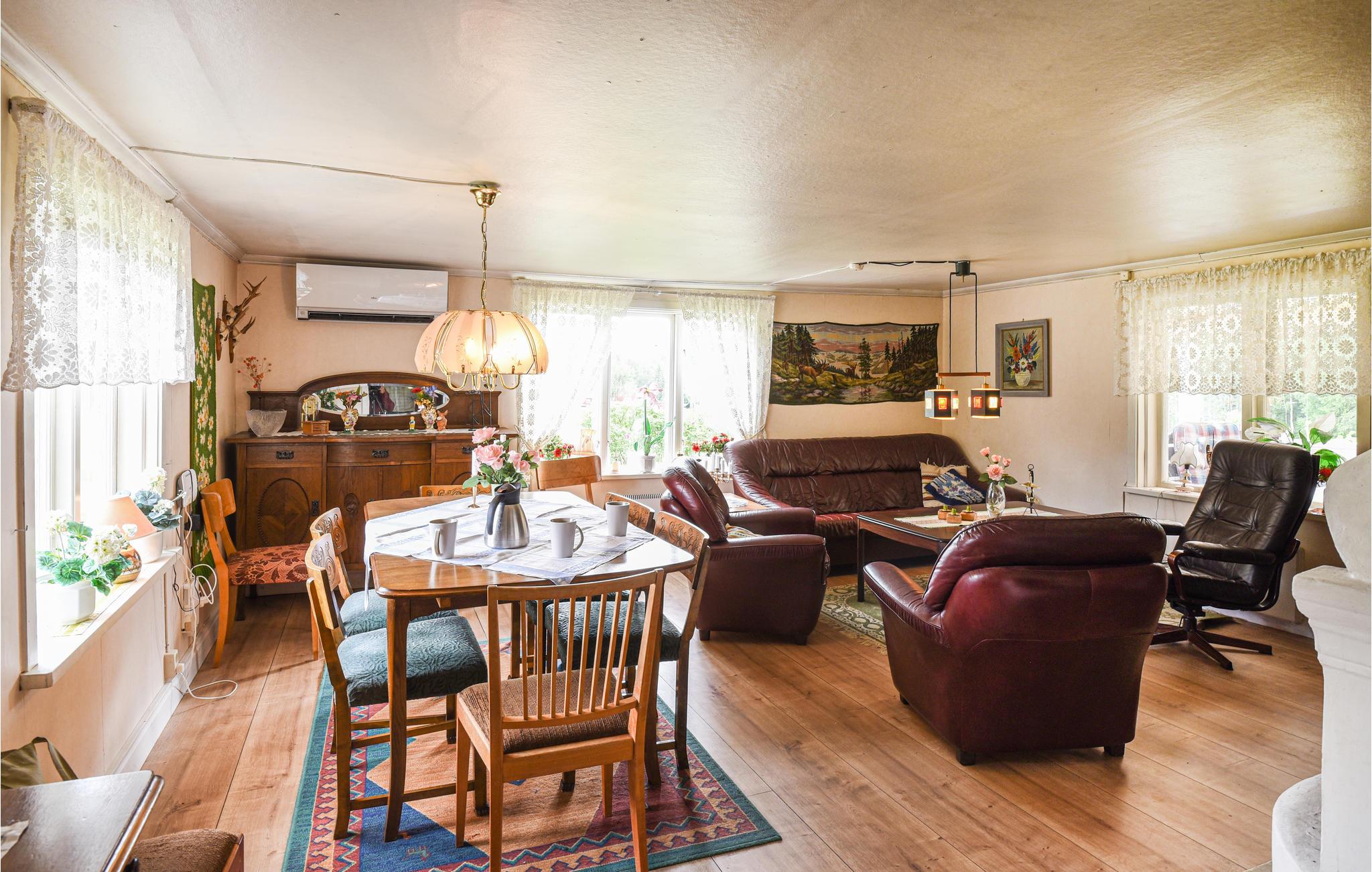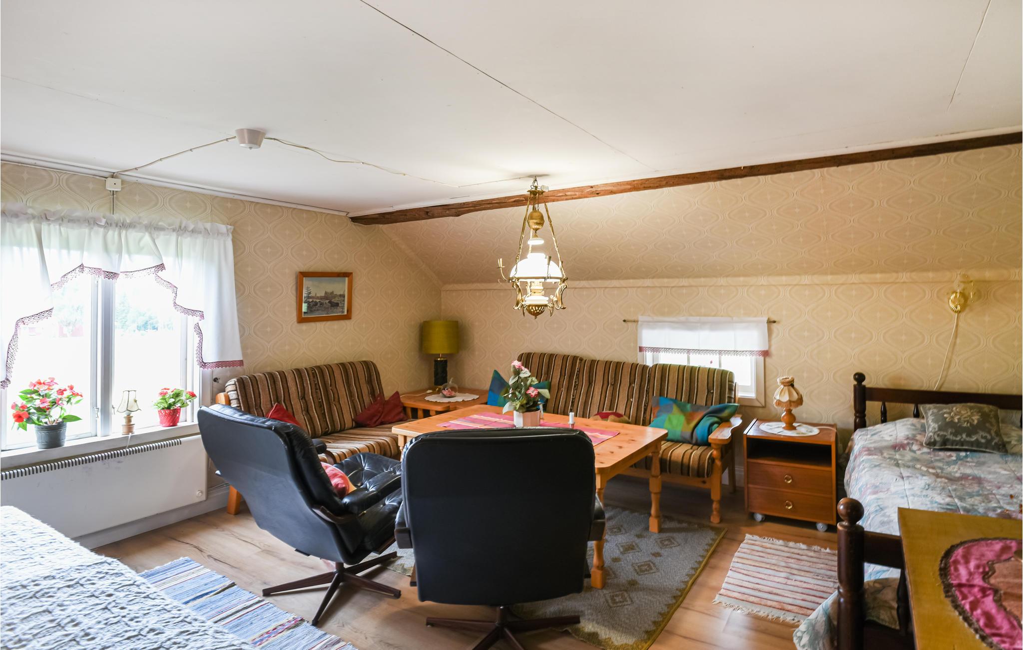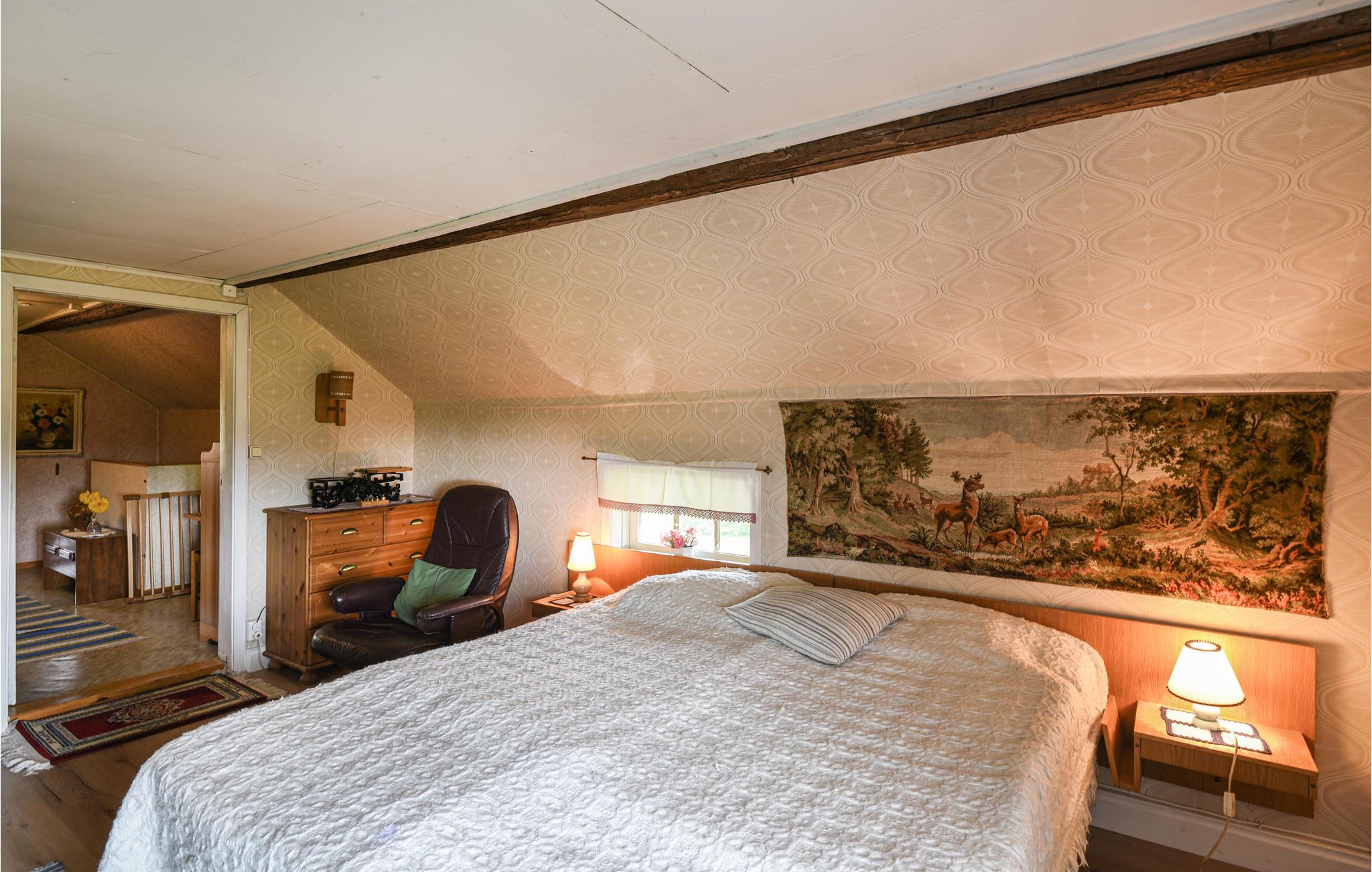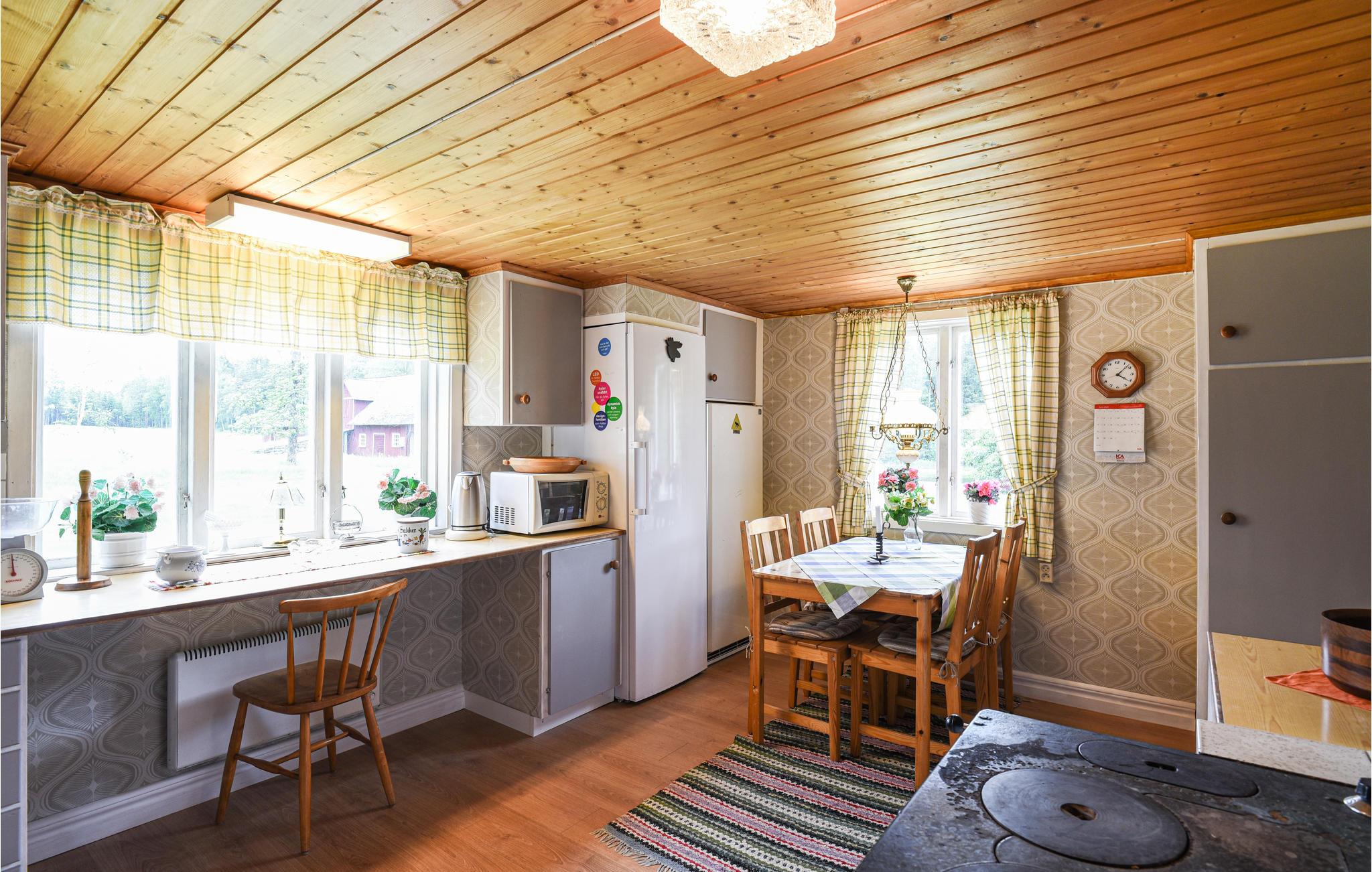 Udsigt over dam med bademulighed og båd på grunden. Feriehuset ligger lige uden for Ryd i nærheden af Jönköping, men i Västergötland. I 2021 er der foretaget flere renoveringer på boligen, herunder nye gulve i flere af rummene.