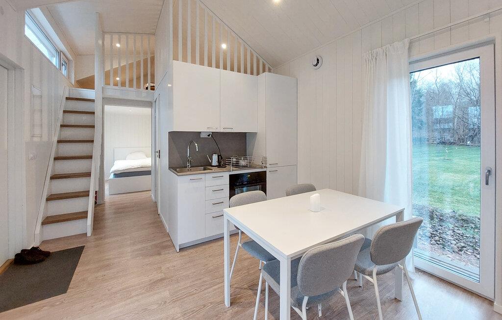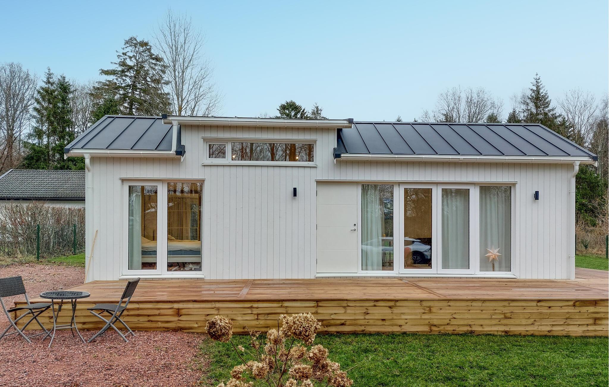 Dette hus byder jer velkommen med en lys atmosfære, hvor gulv til loft-vinduer bader interiøret med naturligt lys. Nyd den storslåede udsigt over det omkringliggende grønt fra sofaen, slap af med en kop kaffe og kom i ferietilstand. Tilbered lækre måltider sammen og nyd dem i godt selskab.