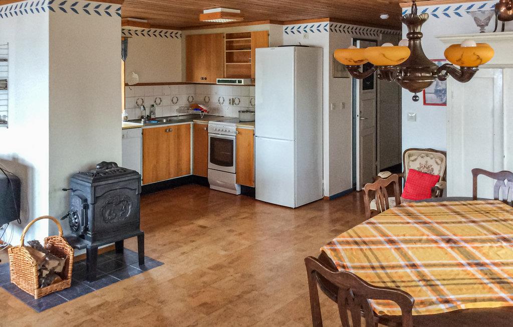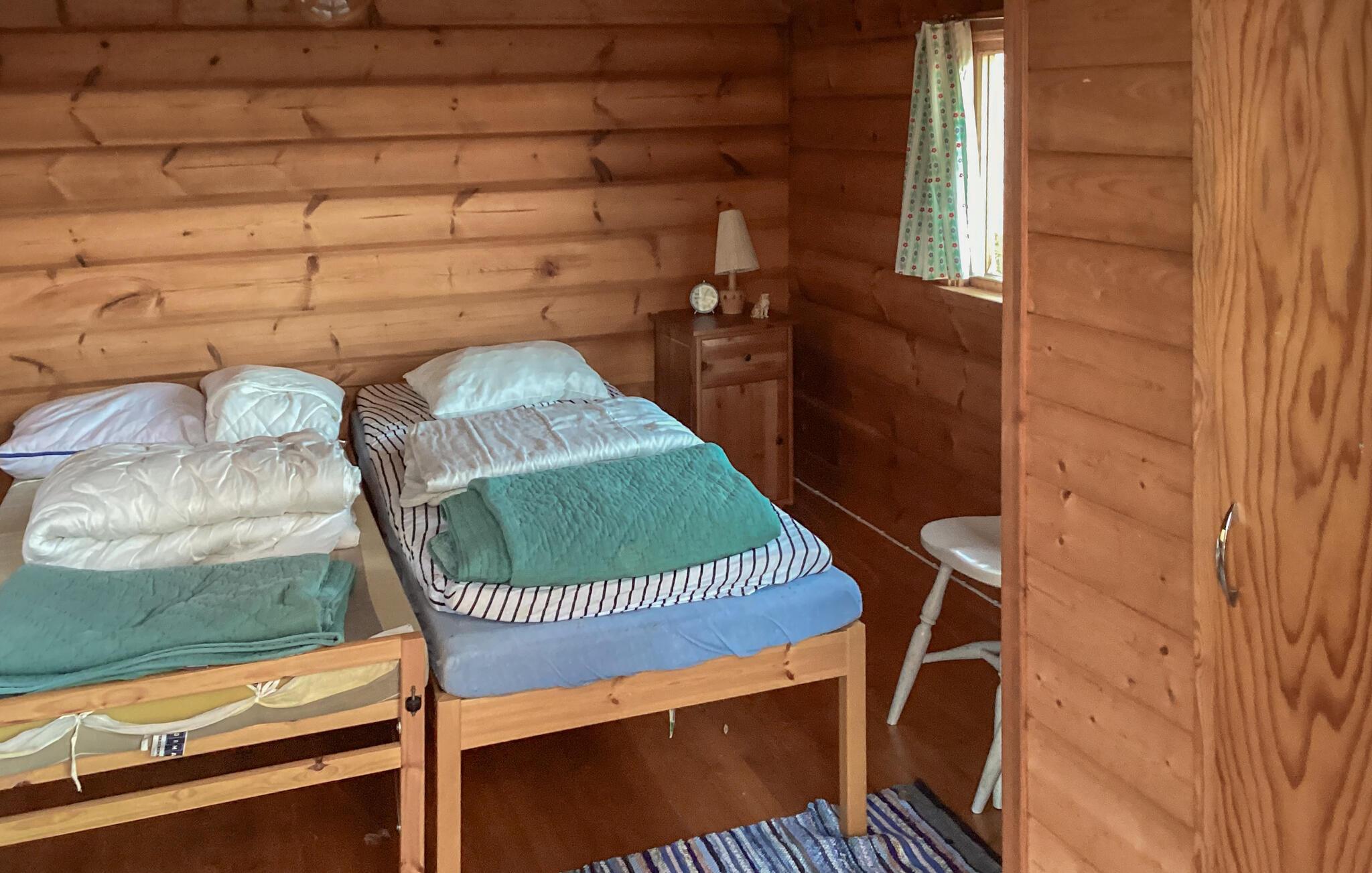 Dette feriehus til seks voksne og to børn ligger kun få meter fra vandet. Husets boligareal er inddelt i tre soveværelser, et badeværelse, et køkken og et opholdsområde. Nyd afslappende aftener i sofaen med knitrende ild i brændeovnen og en god bog. I saunaen kan I få varmen efter en dejlig fisketur.