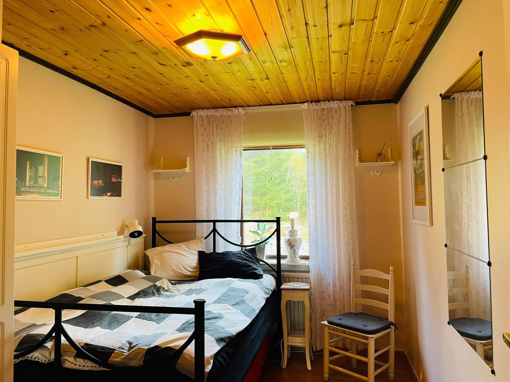 Du välkomnas in i ett allrum och kök med öppen planlösning. Här finns ett mindre matbord för dagens första kopp kaffe. Vardagsrummet har två sköna soffor framför kaminen som sprakar gott. Till vänster är en matsal med bord och stolar för 6 personer. Intill köket ligger badrummet med dusch/wc och även tvättmaskin. Intill ligger husets större sovrum med en dubbelsäng 160 cm bred. Bredvid ligger det andra sovrummet/alkoven med en säng på 120 cm och innanför det andra med en säng på 140 cm. Totalt 4 -5 personer beroende hur man fördelar sängplatserna.