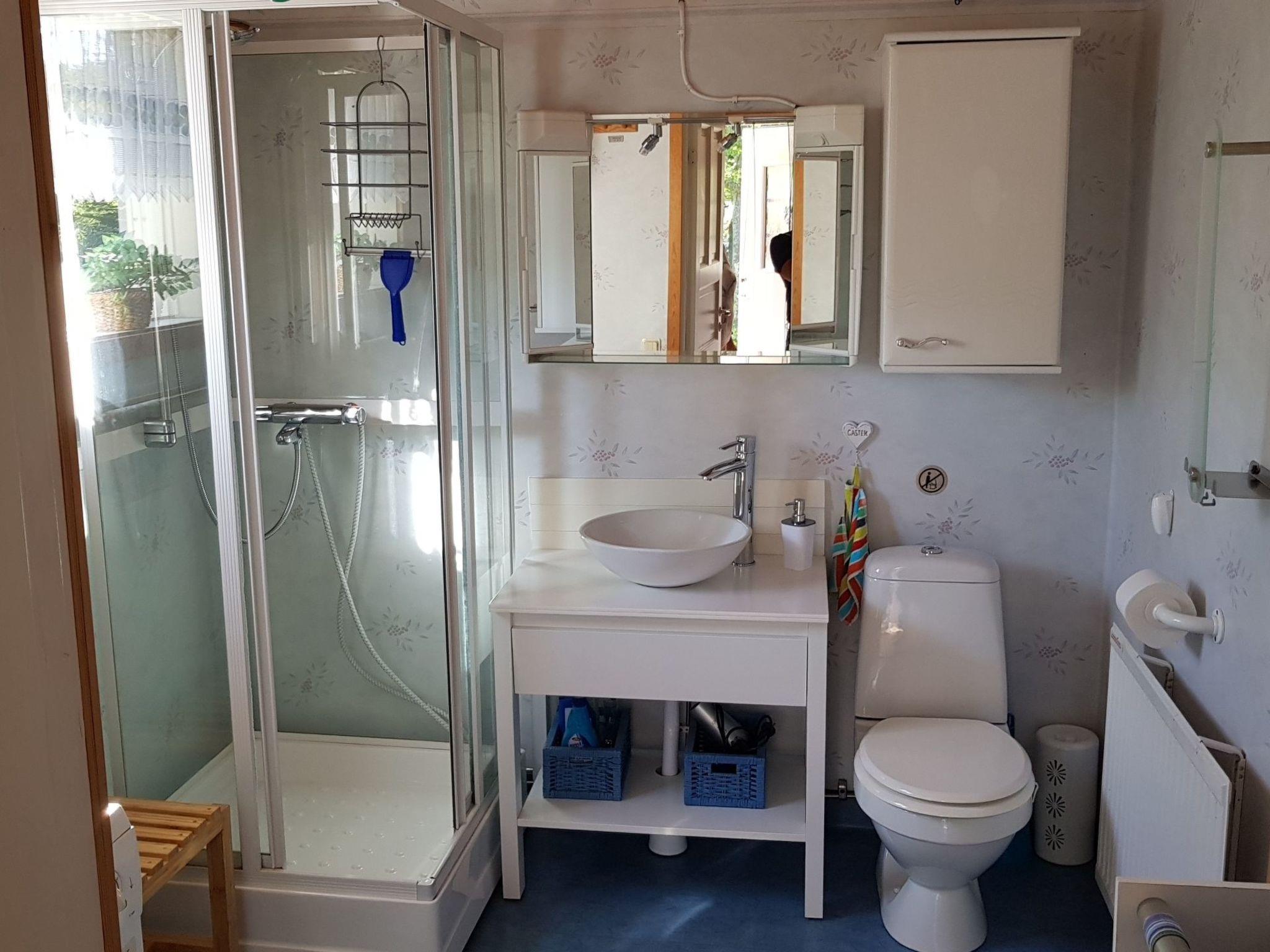 The house with a typical Swedish wooden construction, a red exterior facade with white edges and windows, and providing around 80m² of living space, can accommodate four people and there is also a guest house for two people. The house has a bathroom with a shower, WC and washing machine. The kitchen has a dining space and access to the garden and is equipped with a fridge, microwave, freezer, stove, extractor fan and dishwasher, as well as other appliances (toaster, kettle, espresso machine, bread cutter). The living room is comfortably furnished. It has an open fireplace, a radio, an LED TV with a satellite receiver. You go through the living room to the conservatory with access to the terrace and the garden.