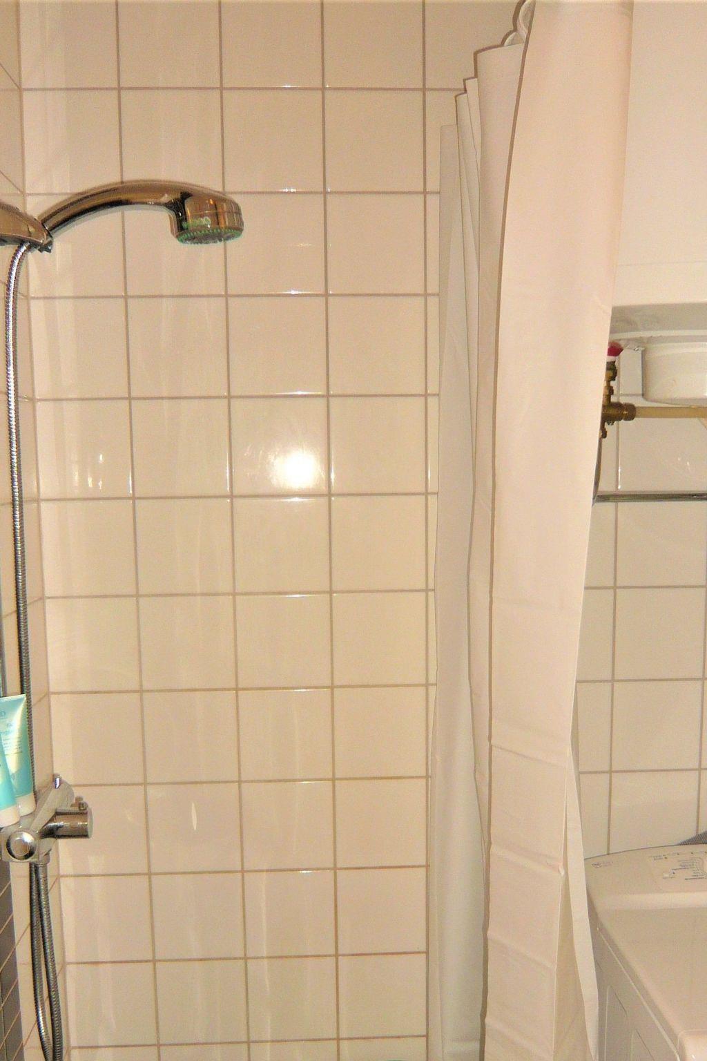 The bathroom has white tiled walls and is equipped with a shower, WC and washing machine.