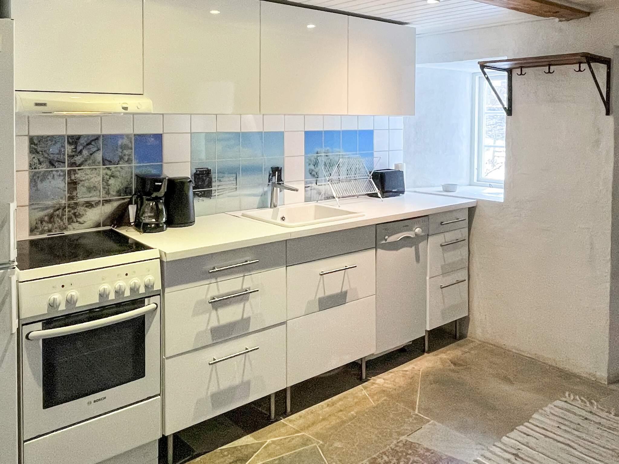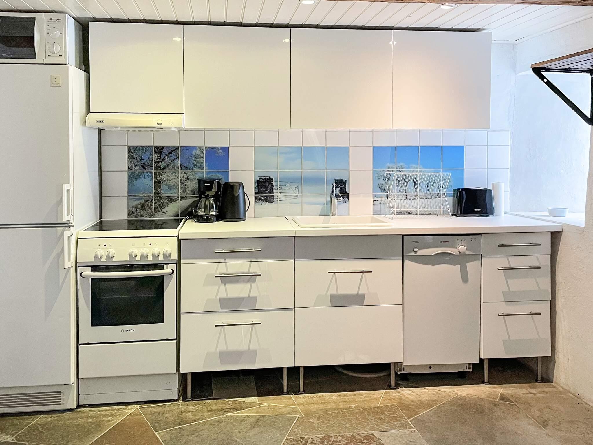 Køkken: El-komfur, køleskab, mikroovn, kaffemaskine, opvaskemask., vand fra brønd