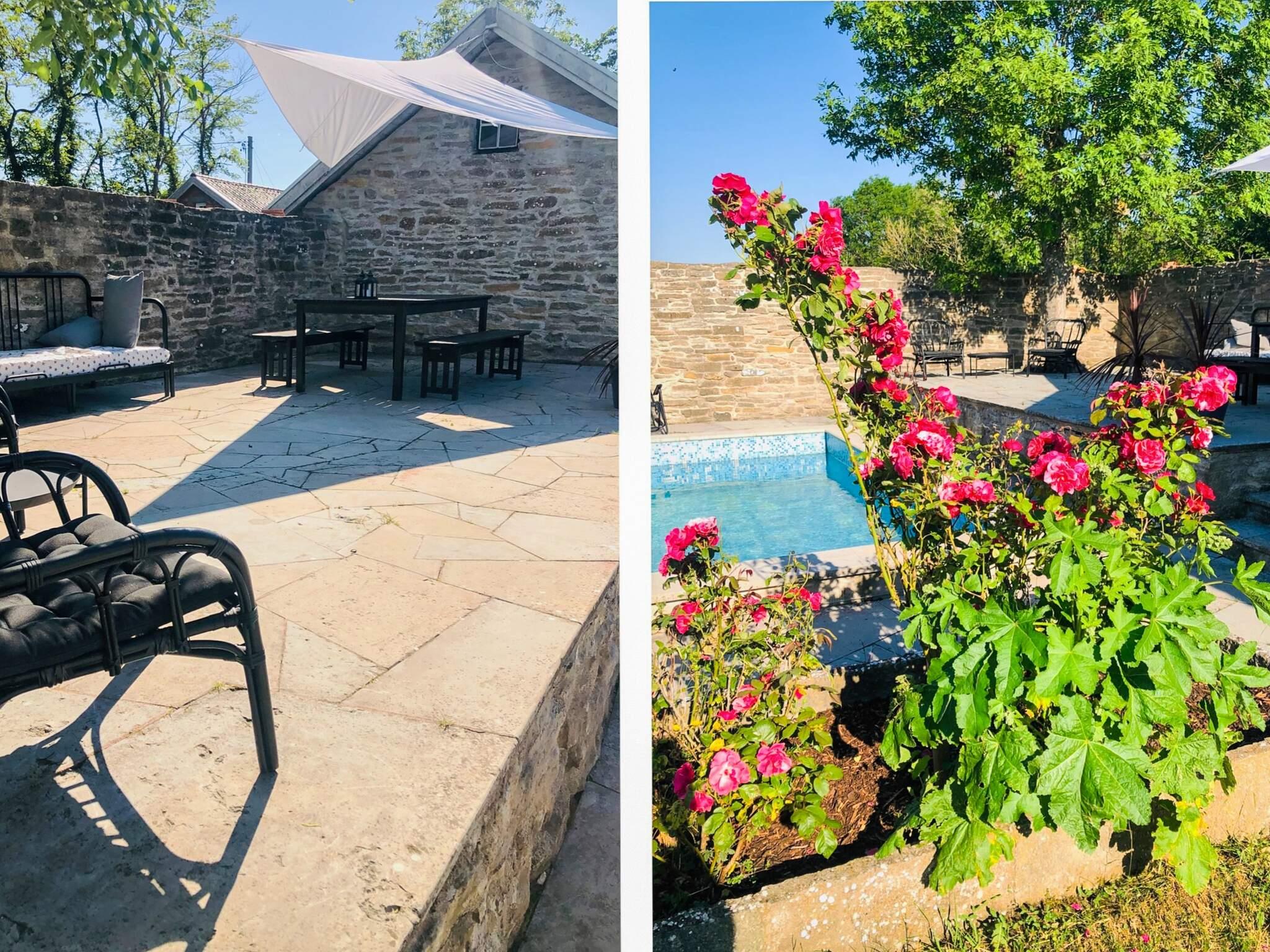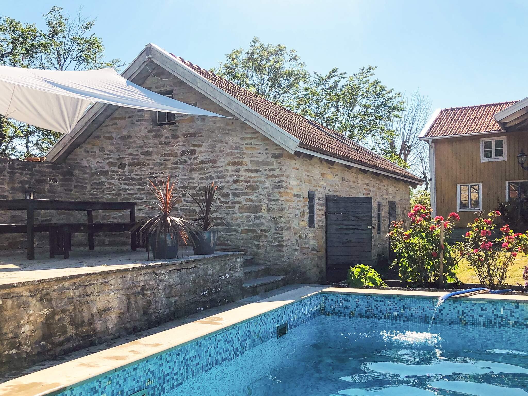 En uppfriskande saltvattenpool ligger i hjärtat av en innergård omgiven av stockrosor, lavendel och ölandsk sten – den perfekta platsen att sträcka ut sig på en solstol och njuta av den fridfulla omgivningen.