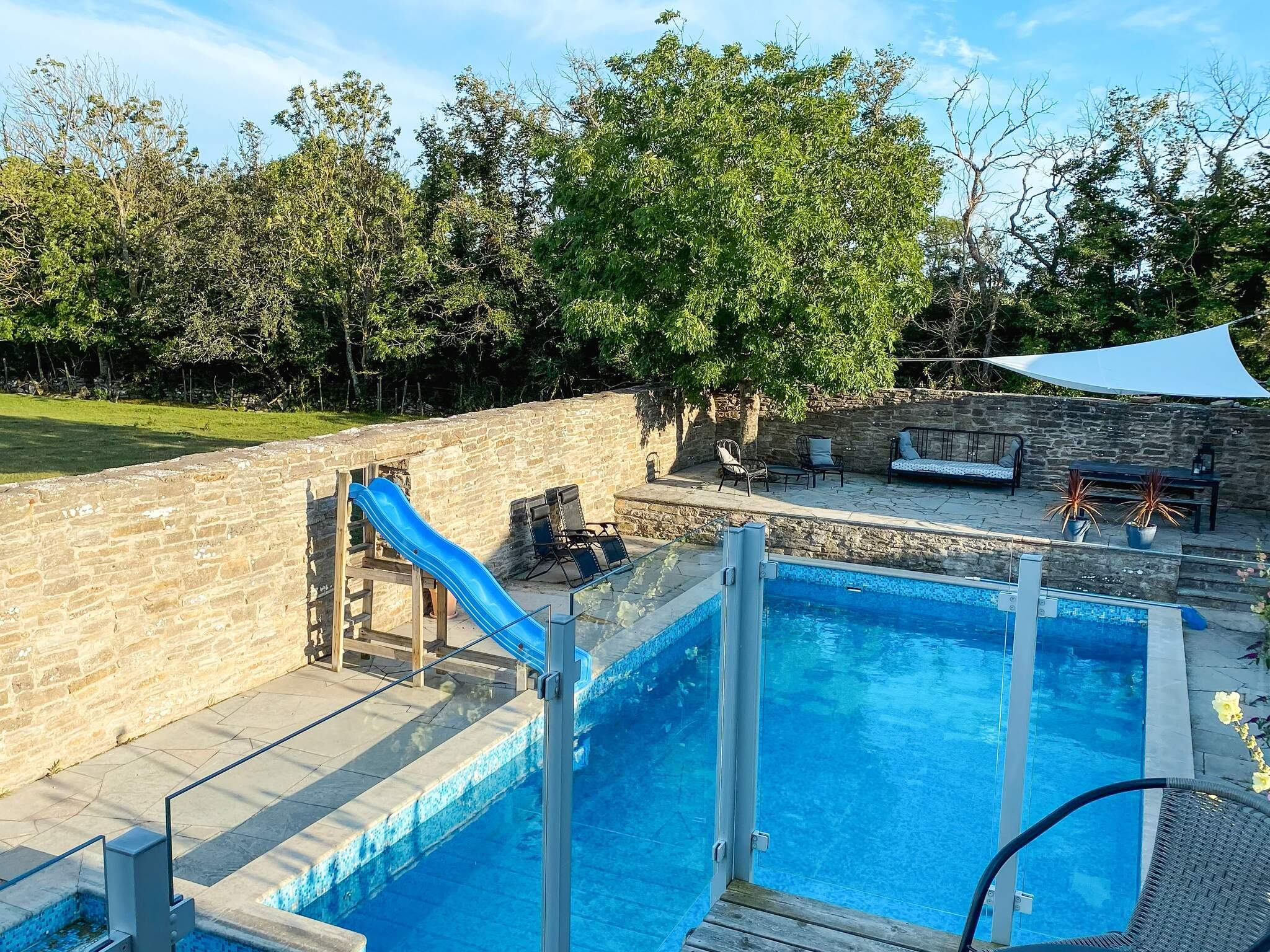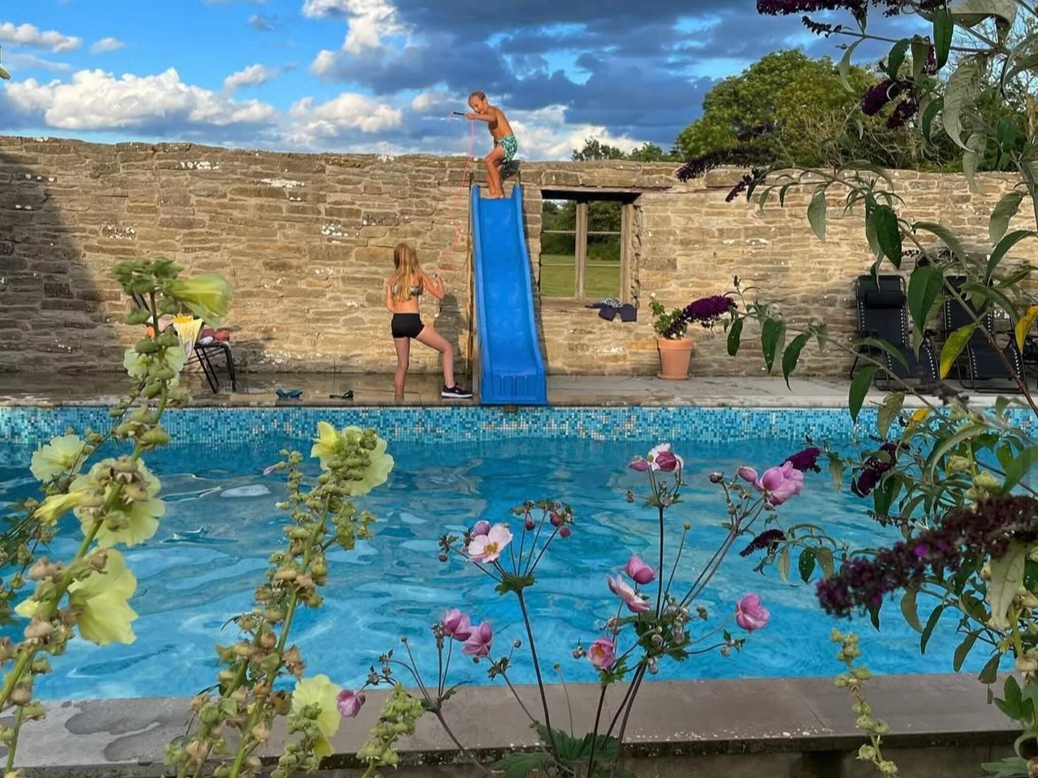 En barnrutschkana i poolen bidrar till den familjevänliga atmosfären.