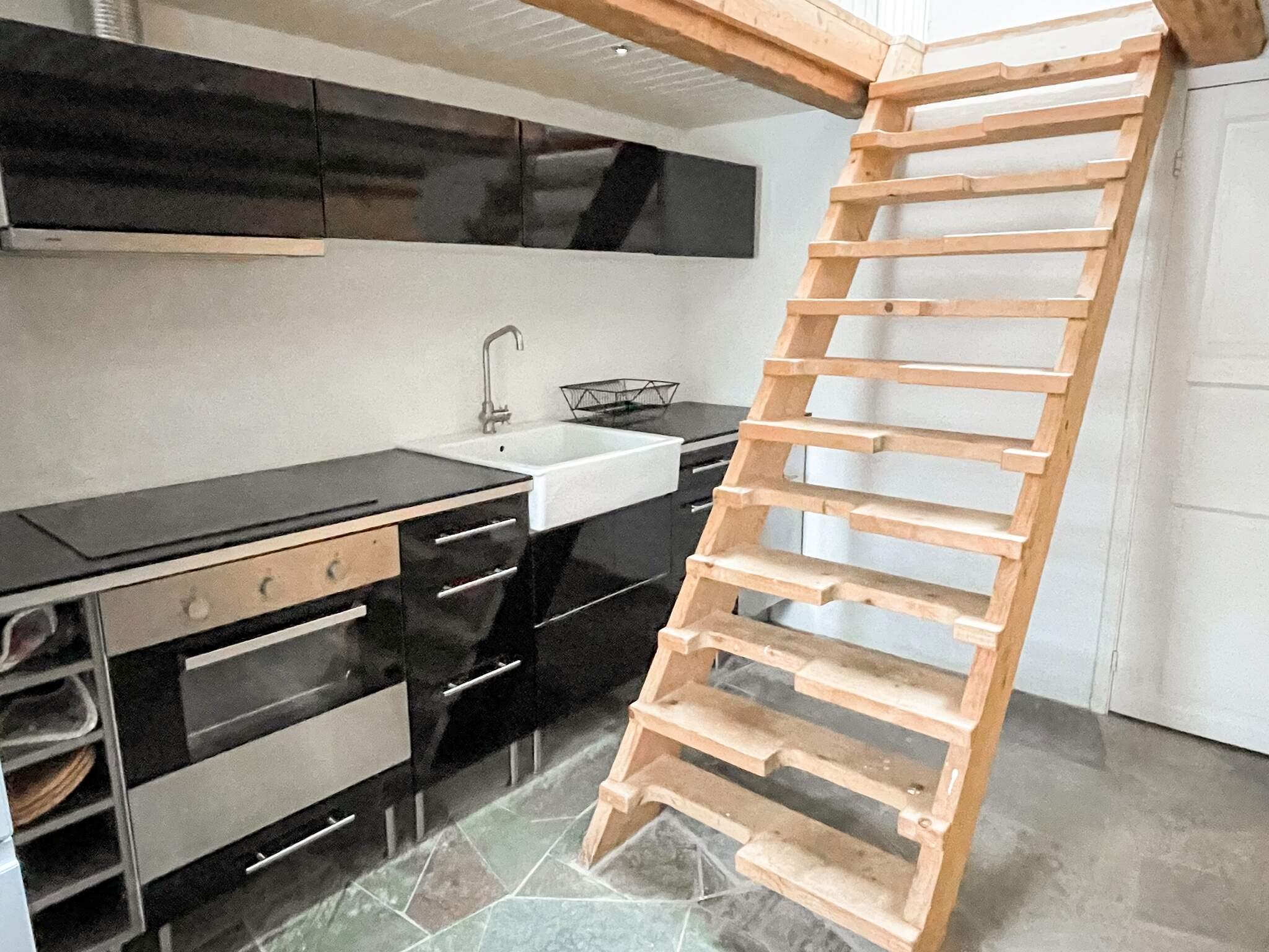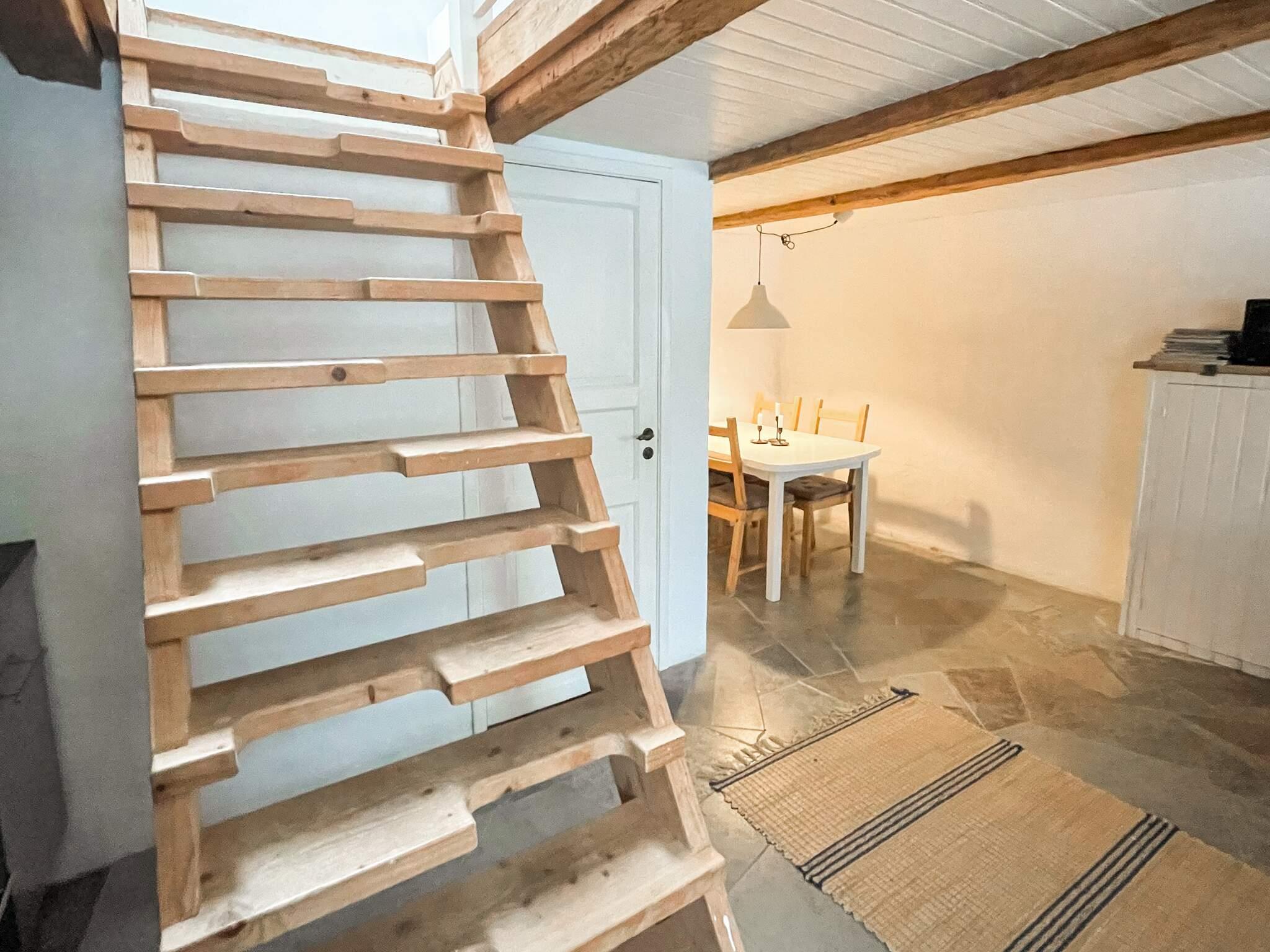 Etagelägenheten har ett modernt kök, matplats och badrum på nedre plan, medan det öppna övre plan har glaspartier och balkong ut mot Allvaret. Här finns synliga takbjälkar, en dubbelsäng och en vardagsrumsdel med bäddsoffa. Poolens barnrutschkana gör den särskilt välkomnande för familjer.