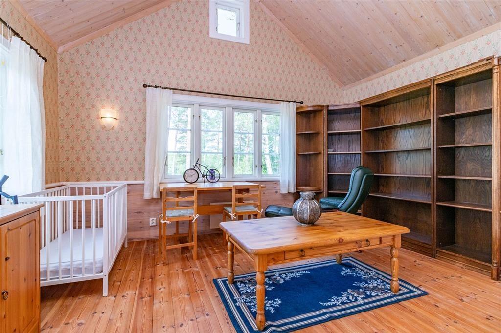 Sommerhus i Mark, Vestsverige, med plads til 7 voksne. Der er en hyggelig indretning med bl.a. brændeovn, og du finder desuden vaskemaskine og opvaskemaskine i boligen.