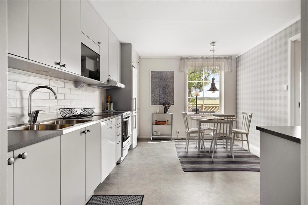 Du kommer ind i huset gennem et stort indgangsparti. For enden af gangen er der et gæstetoilet med håndvask. Fra gangen er der også adgang til køkkenet med et rundt køkkenbord og 4 stole, som også har kaffemaskine, elkedel, mikroovn og brødrister ud over de vigtigste køkkenartikler.