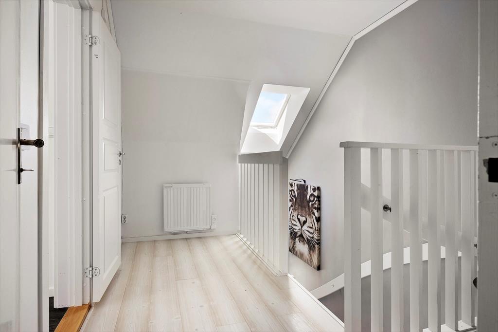 Trappen fører op til en mindre gang. Herfra kommer man til et badeværelse med bruser, toilet, vaskemaskine, tørretumbler, strygebræt og strygejern.